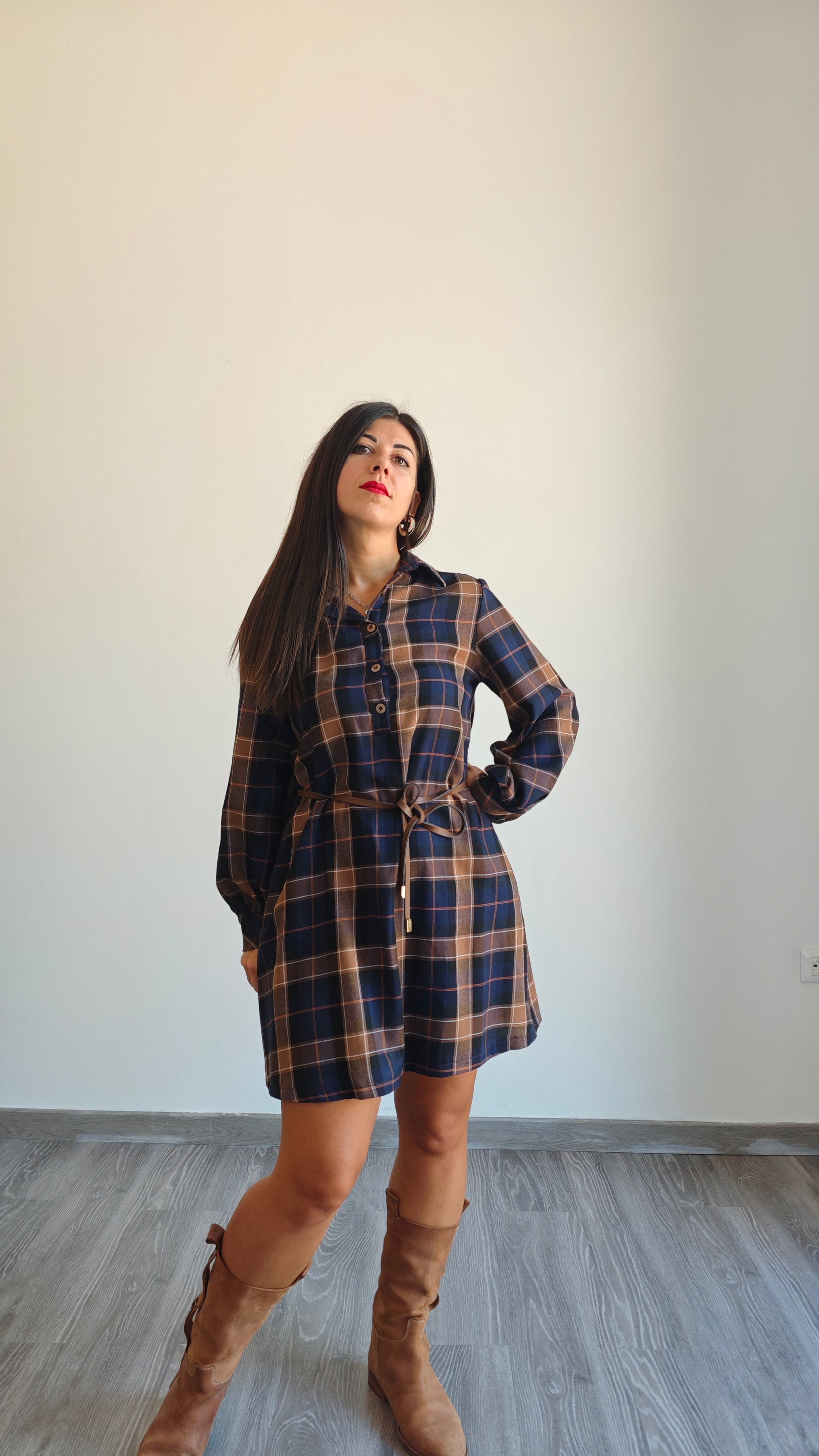 Questo elegante abito camicia a quadri è l'ideale per un look classico e raffinato. Realizzato in Italia, presenta un colletto e quattro bottoni, con una bellissima fantasia a quadri blu e marrone. La cintura in vita con passanti e le tasche comode rendono questo abito non solo elegante, ma anche comodo da indossare.