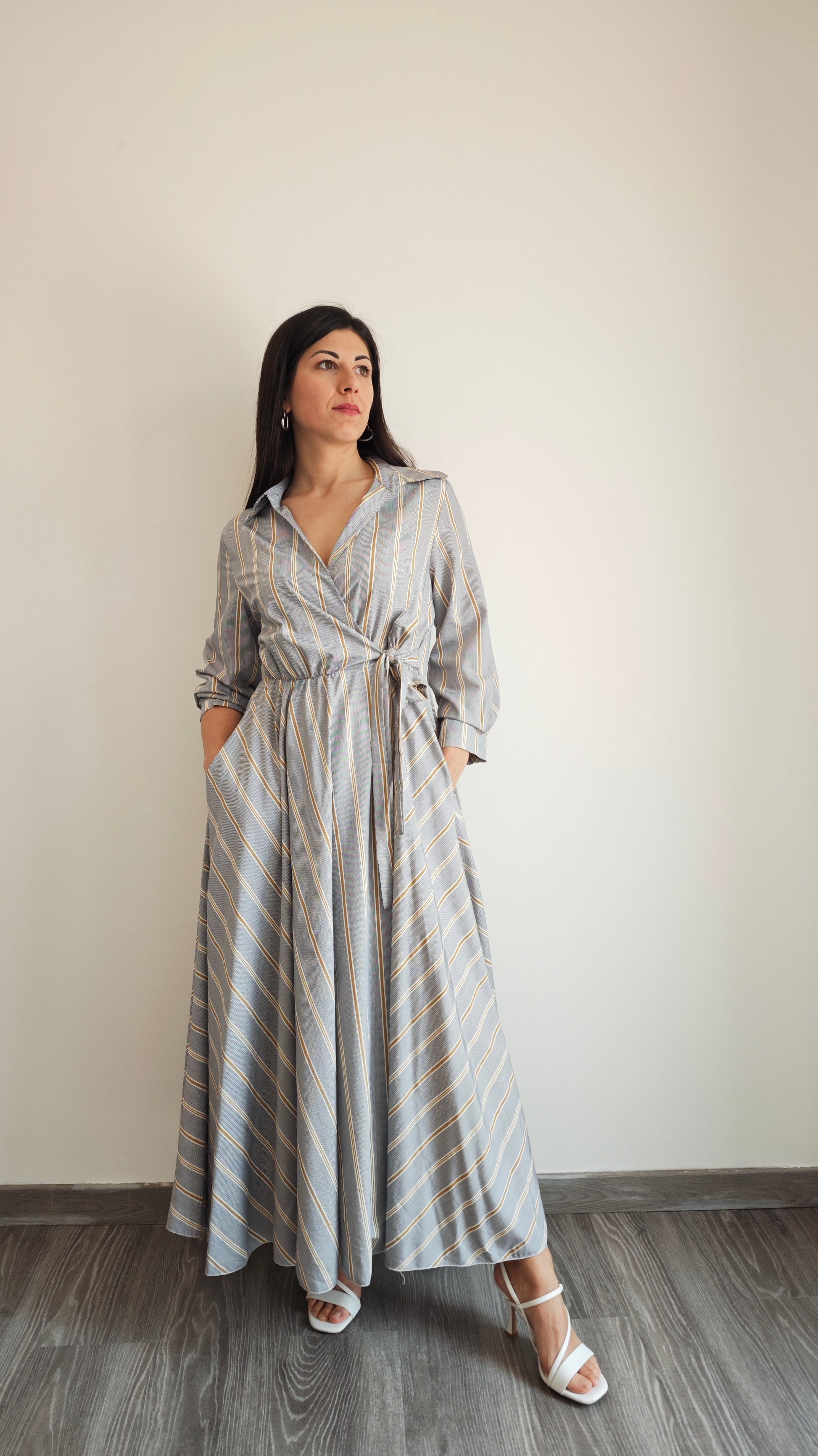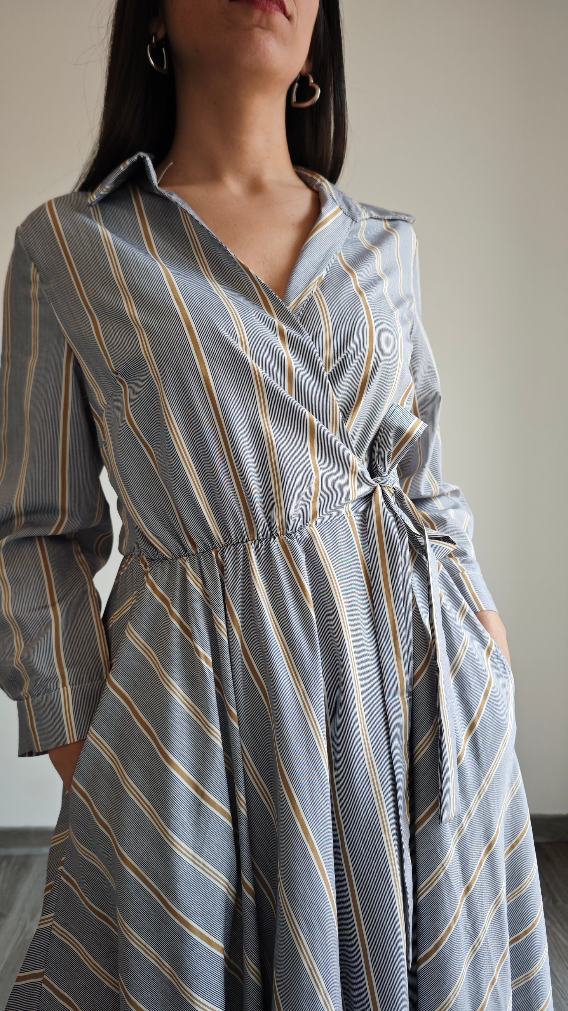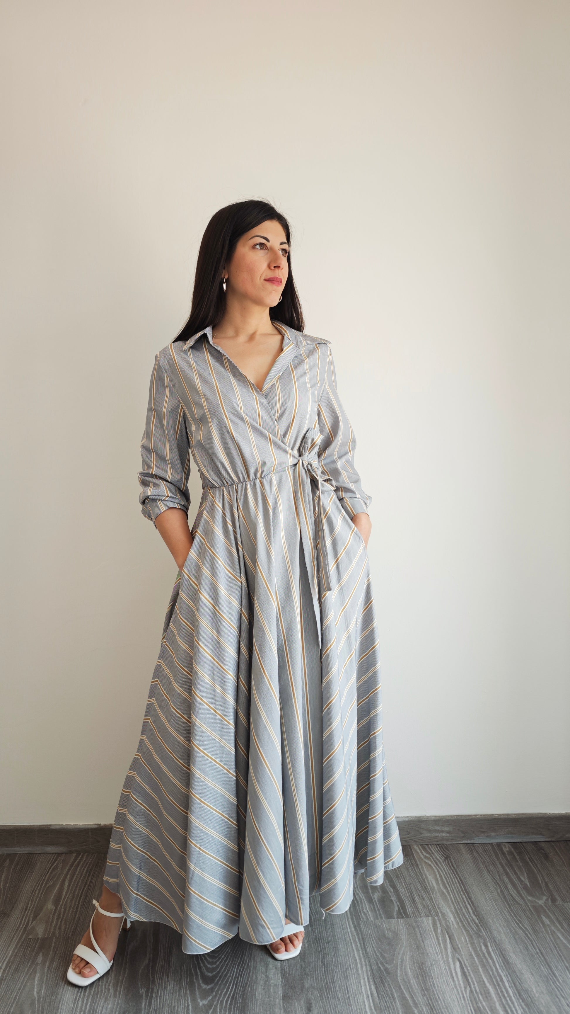 Abito lungo a righe con collo a V e colletto a camicia, ti farà sentire al top in ogni occasione. Chiusura a portafoglio, 2 tasche applicate interne alla gonna , vita elasticizzata con cinturino in tessuto che dona una vestibilità impeccabile. Aggiungi un tocco di classe al tuo guardaroba con questo abito versatile.