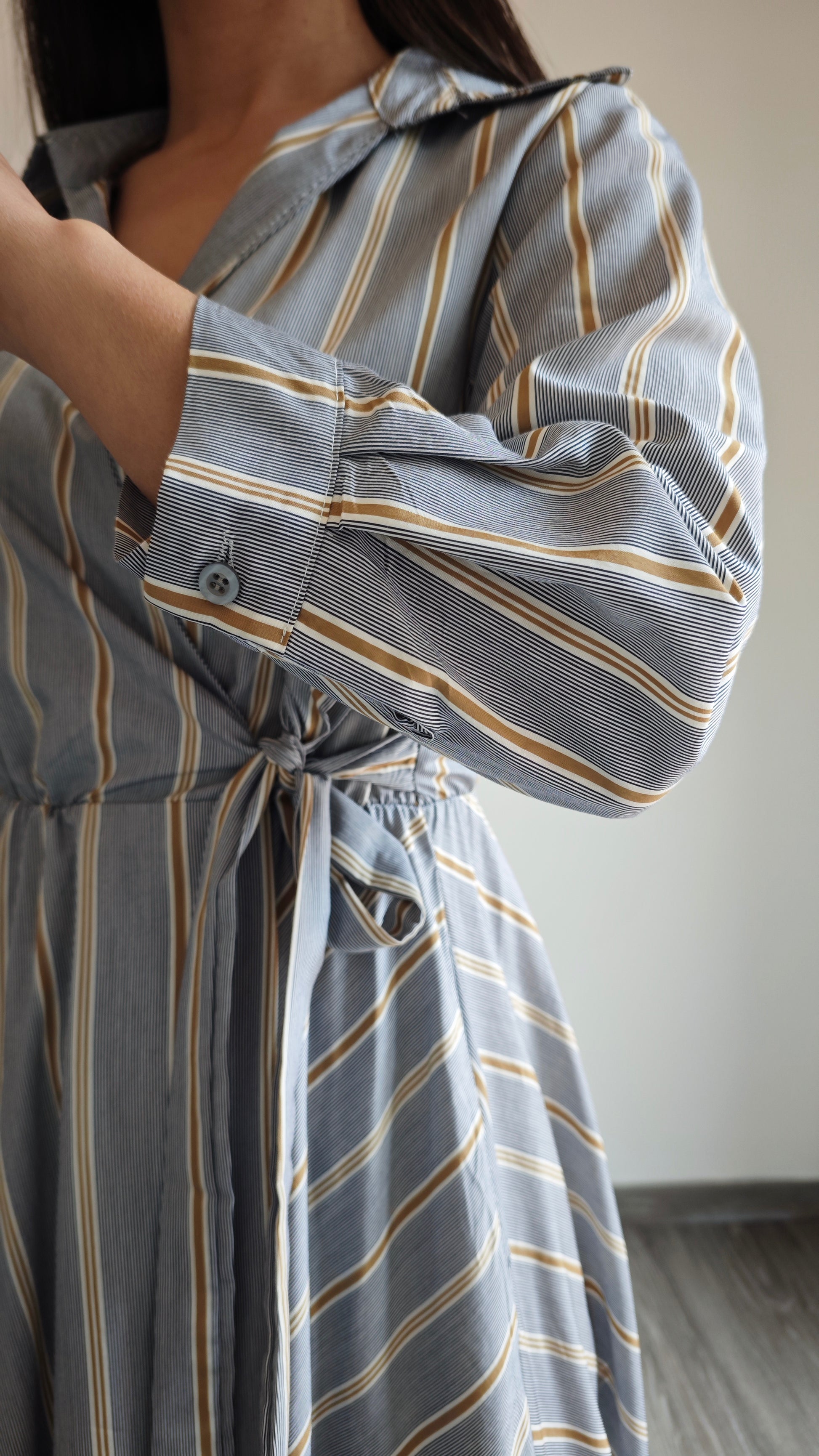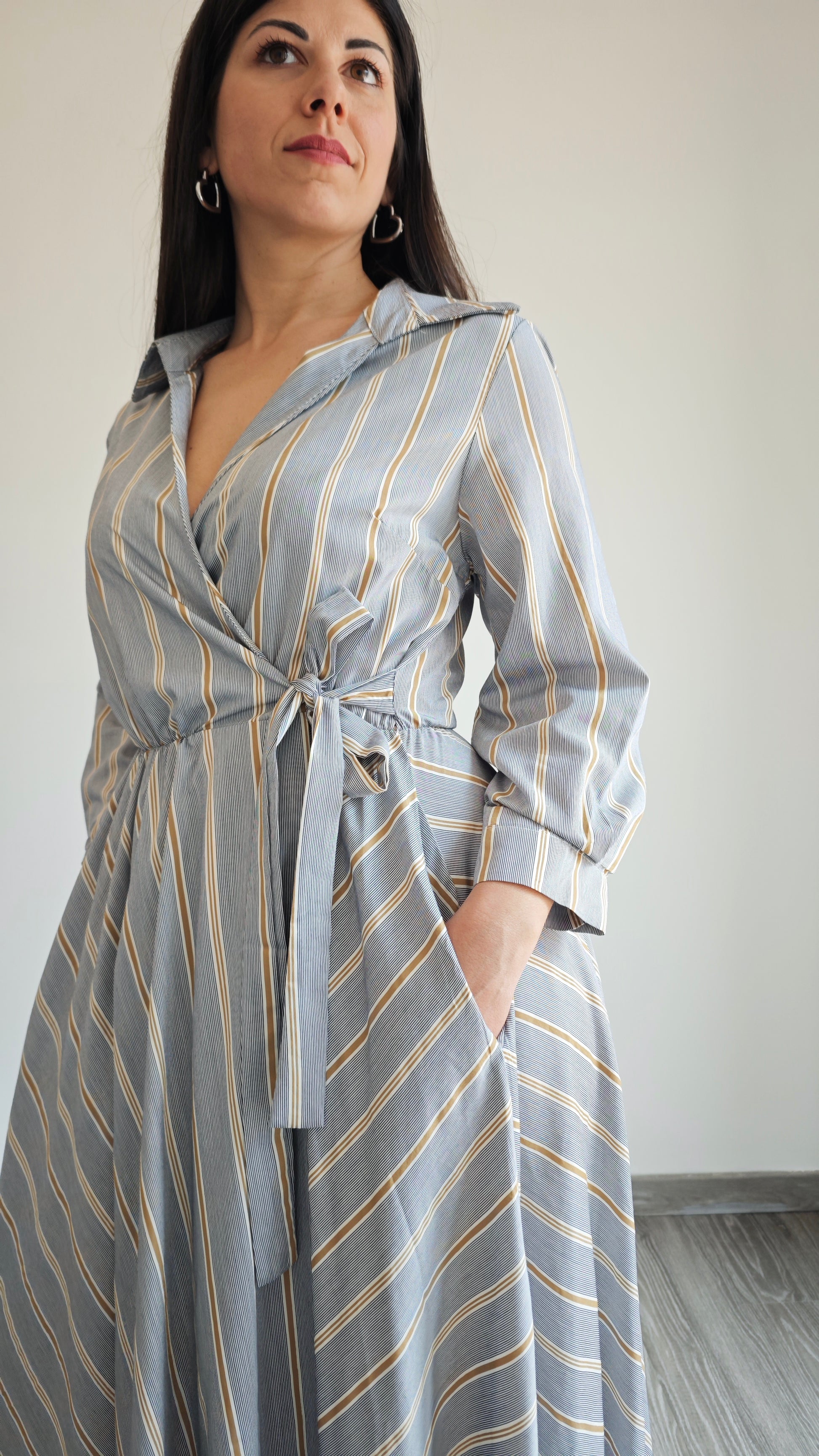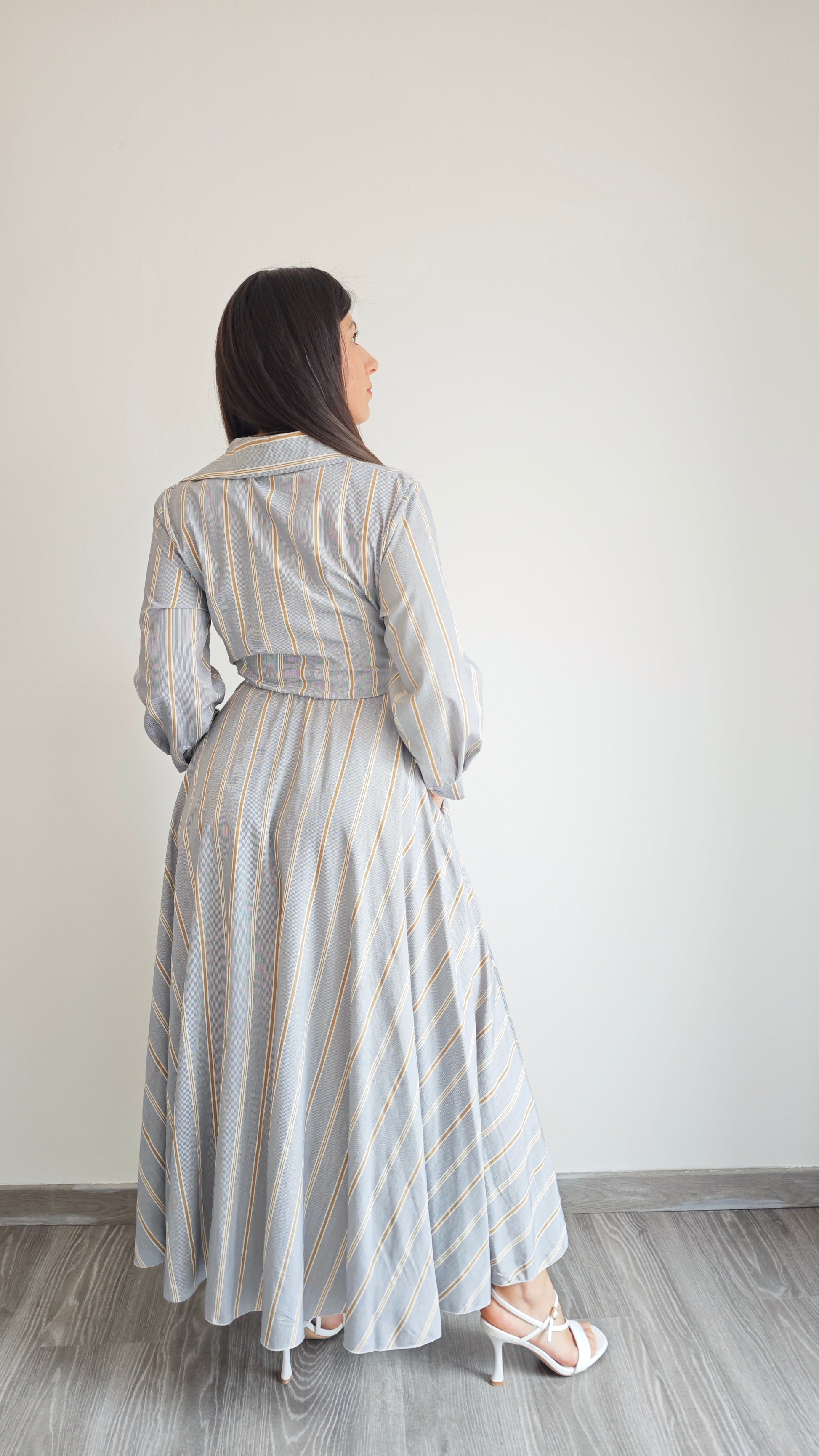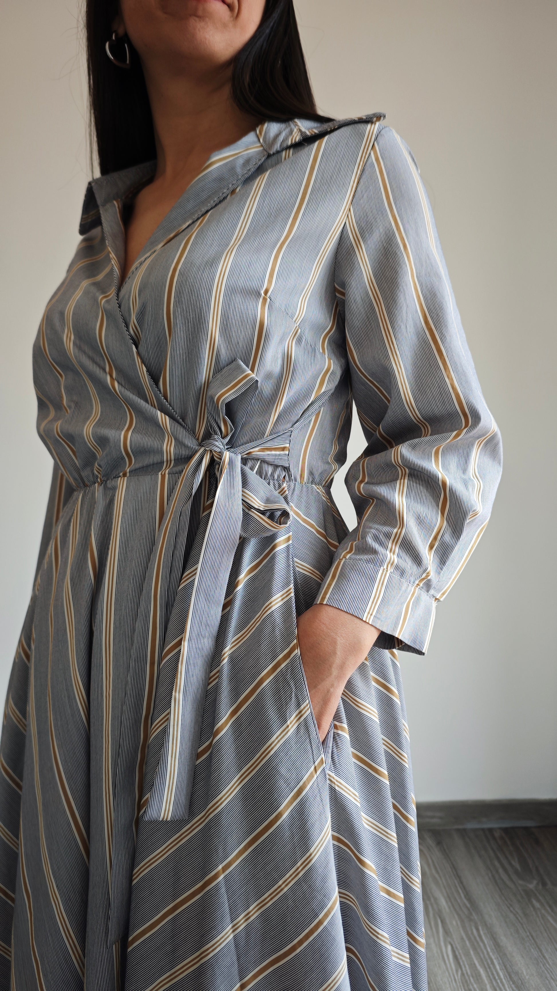 Abito lungo a righe con collo a V e colletto a camicia, ti farà sentire al top in ogni occasione. Chiusura a portafoglio, 2 tasche applicate interne alla gonna , vita elasticizzata con cinturino in tessuto che dona una vestibilità impeccabile. Aggiungi un tocco di classe al tuo guardaroba con questo abito versatile.