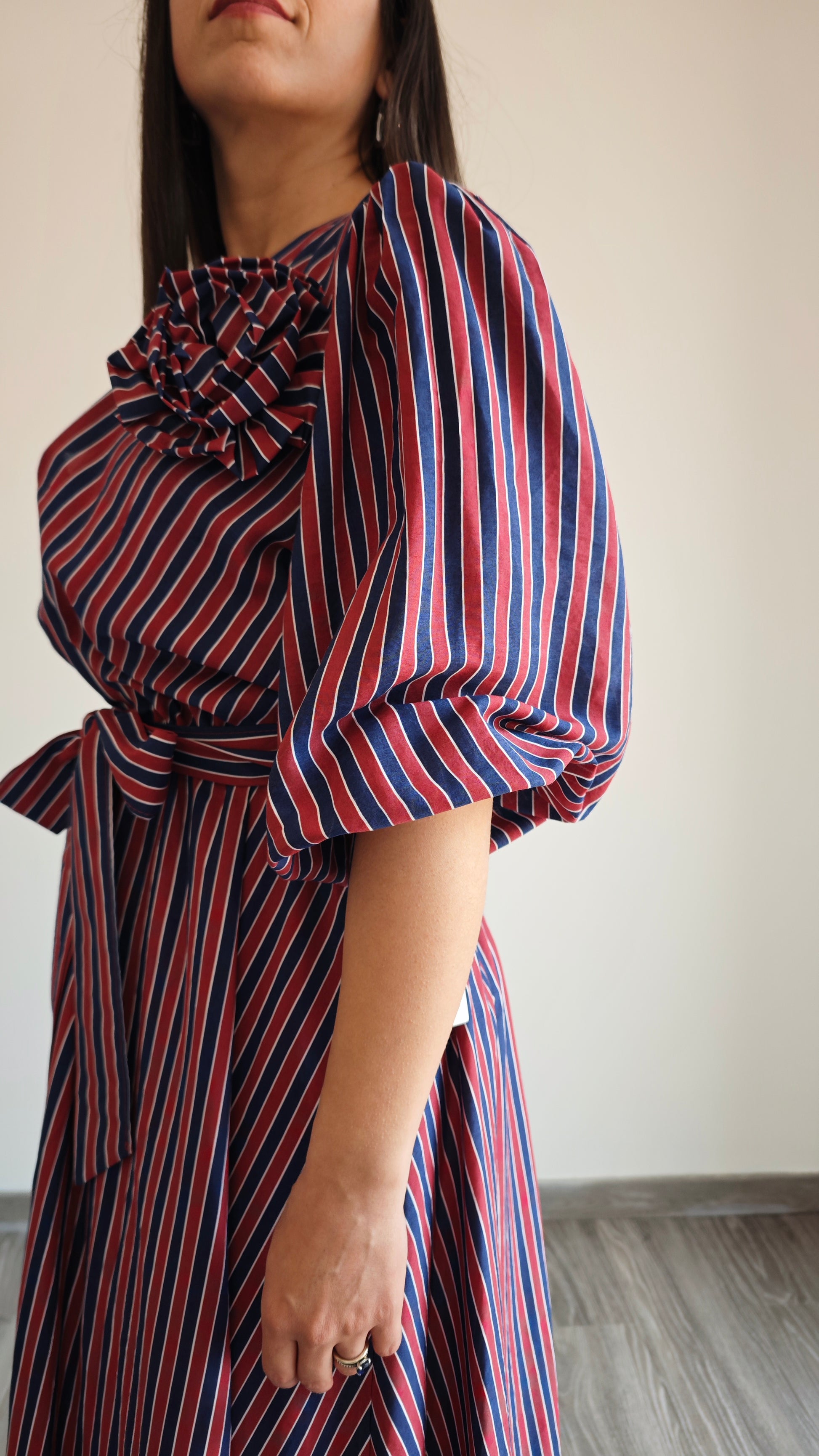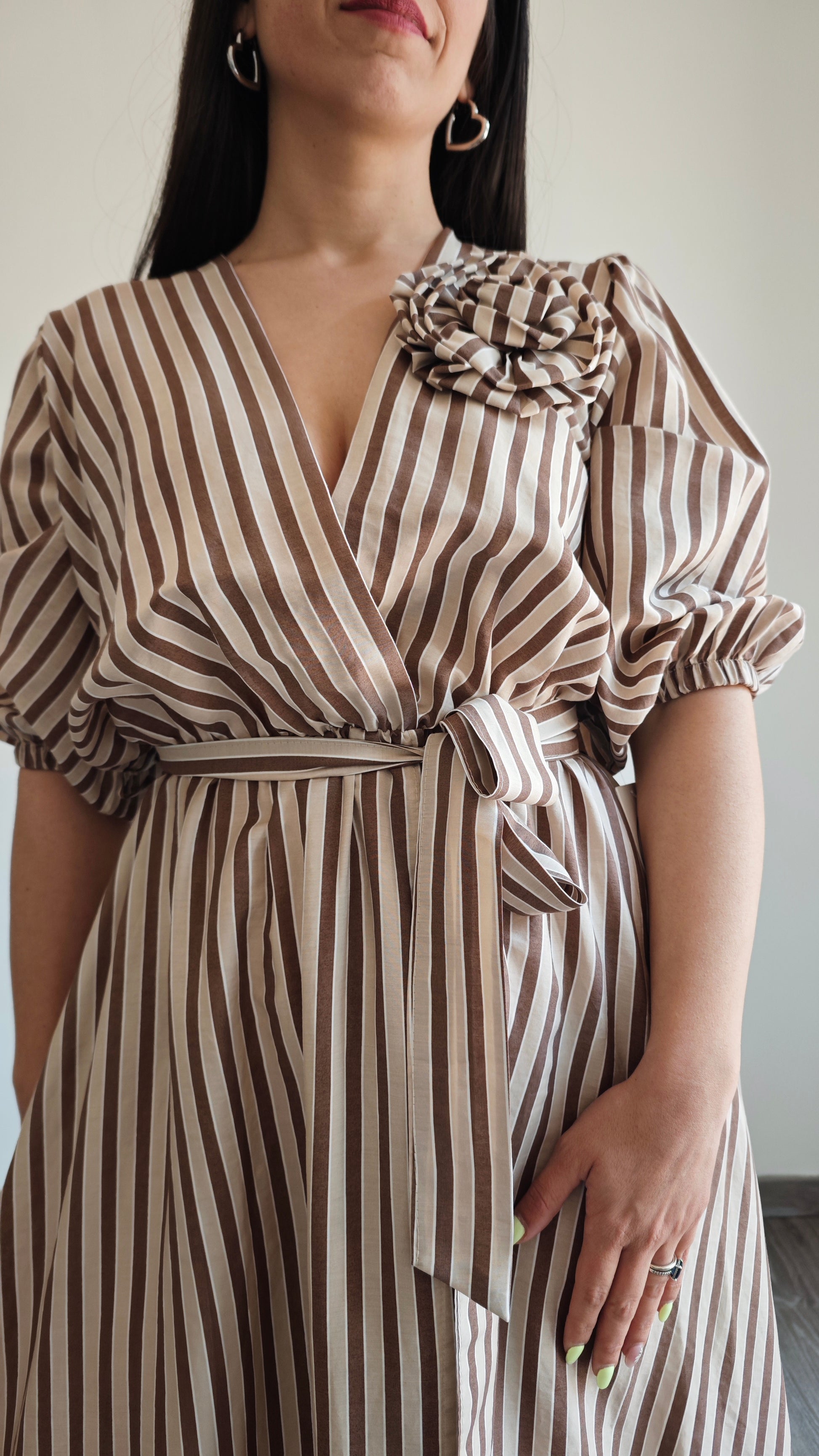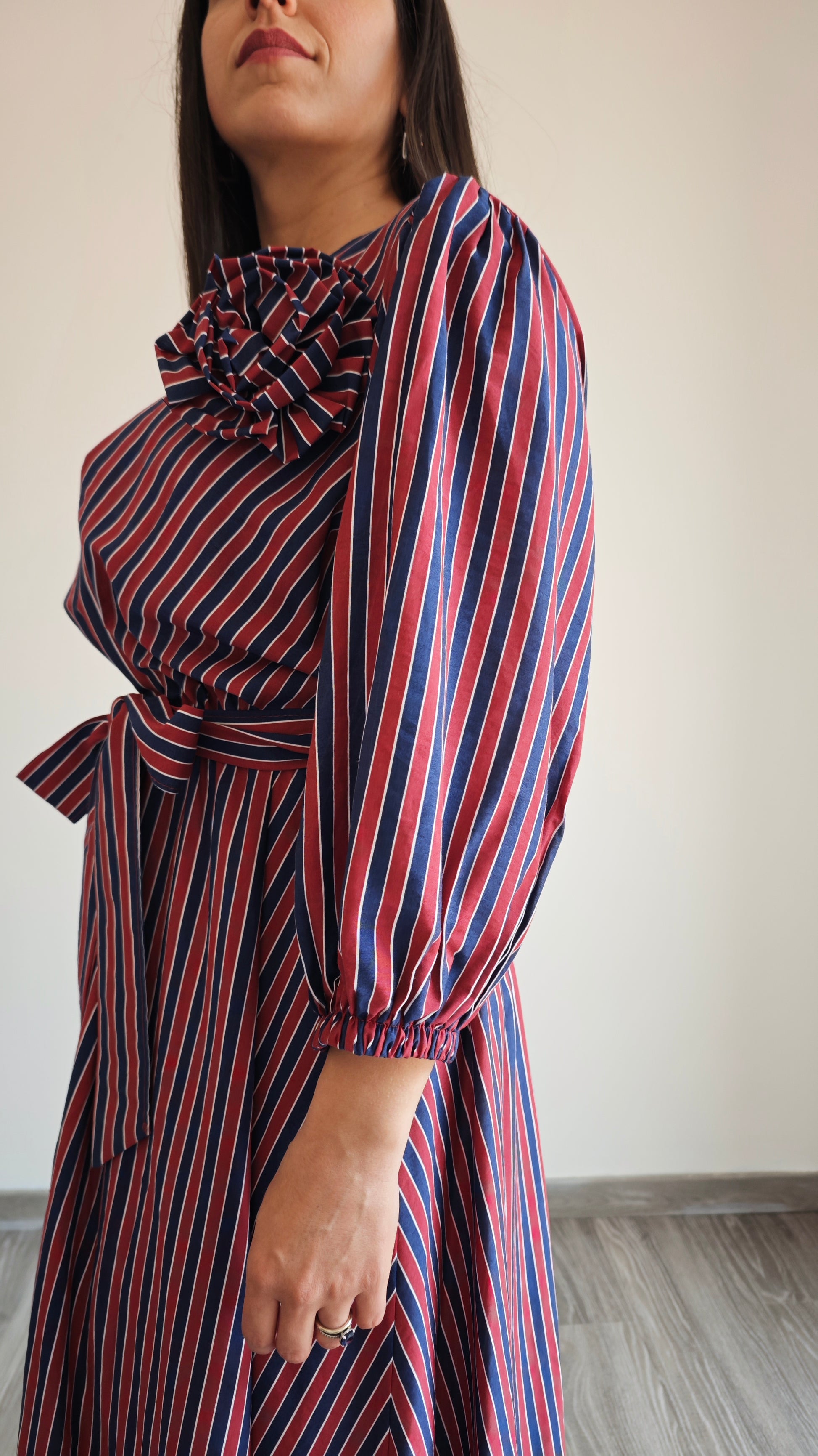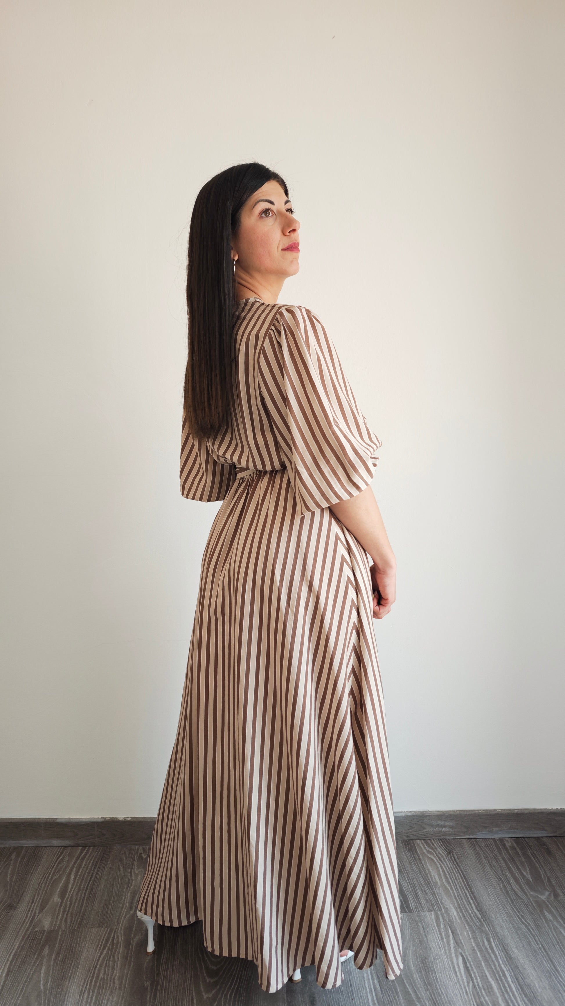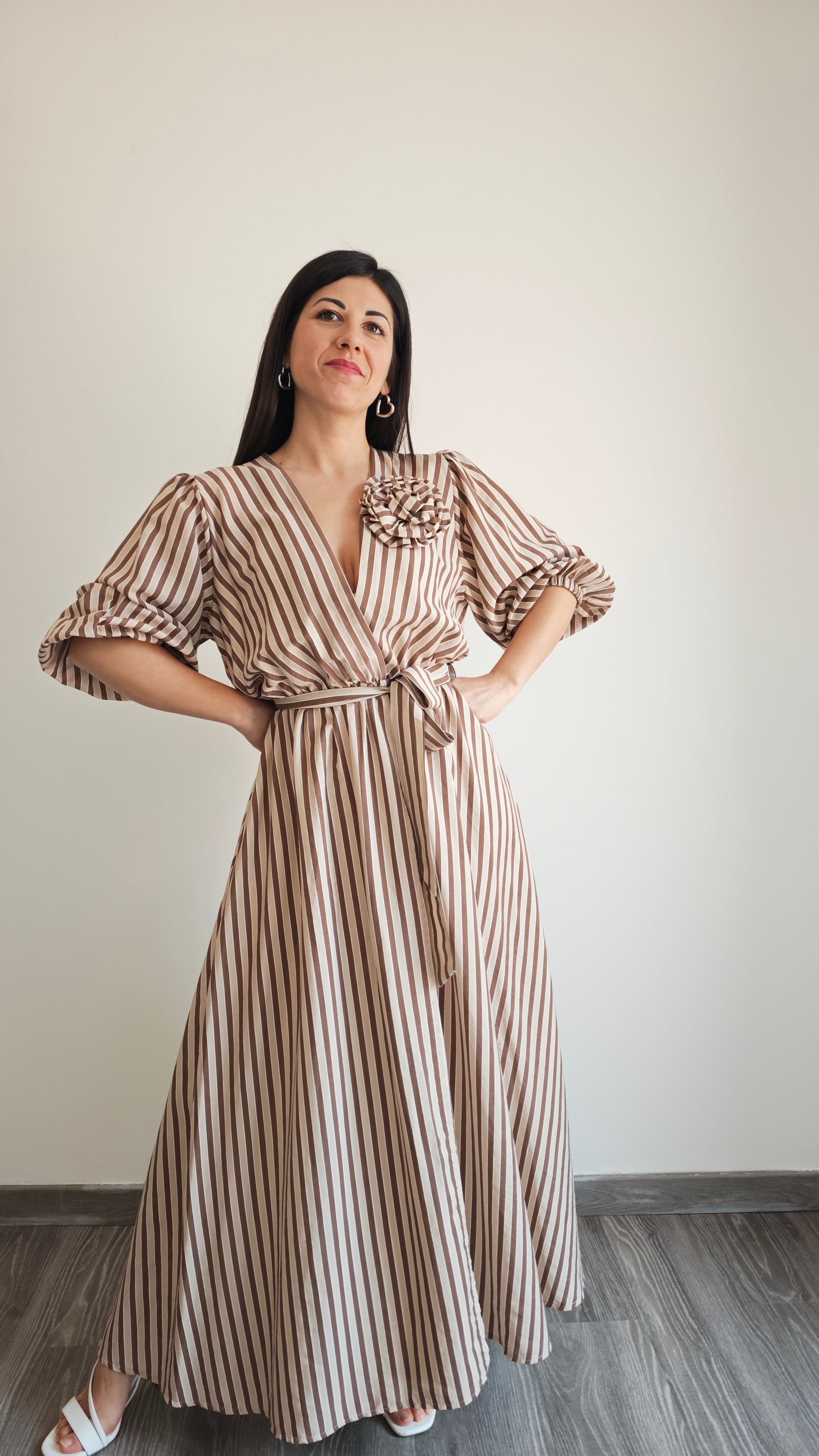 Abito Lungo a Righe con Spacco Laterale, realizzato in morbido cotone, spilla staccabile per un tocco di personalità. La vita elasticizzata e la fusciacca si adattano perfettamente alla tua silhouette, mentre lo spacco profondo aggiunge un tocco di femminilità. Perfetto per un look raffinato e confortevole.