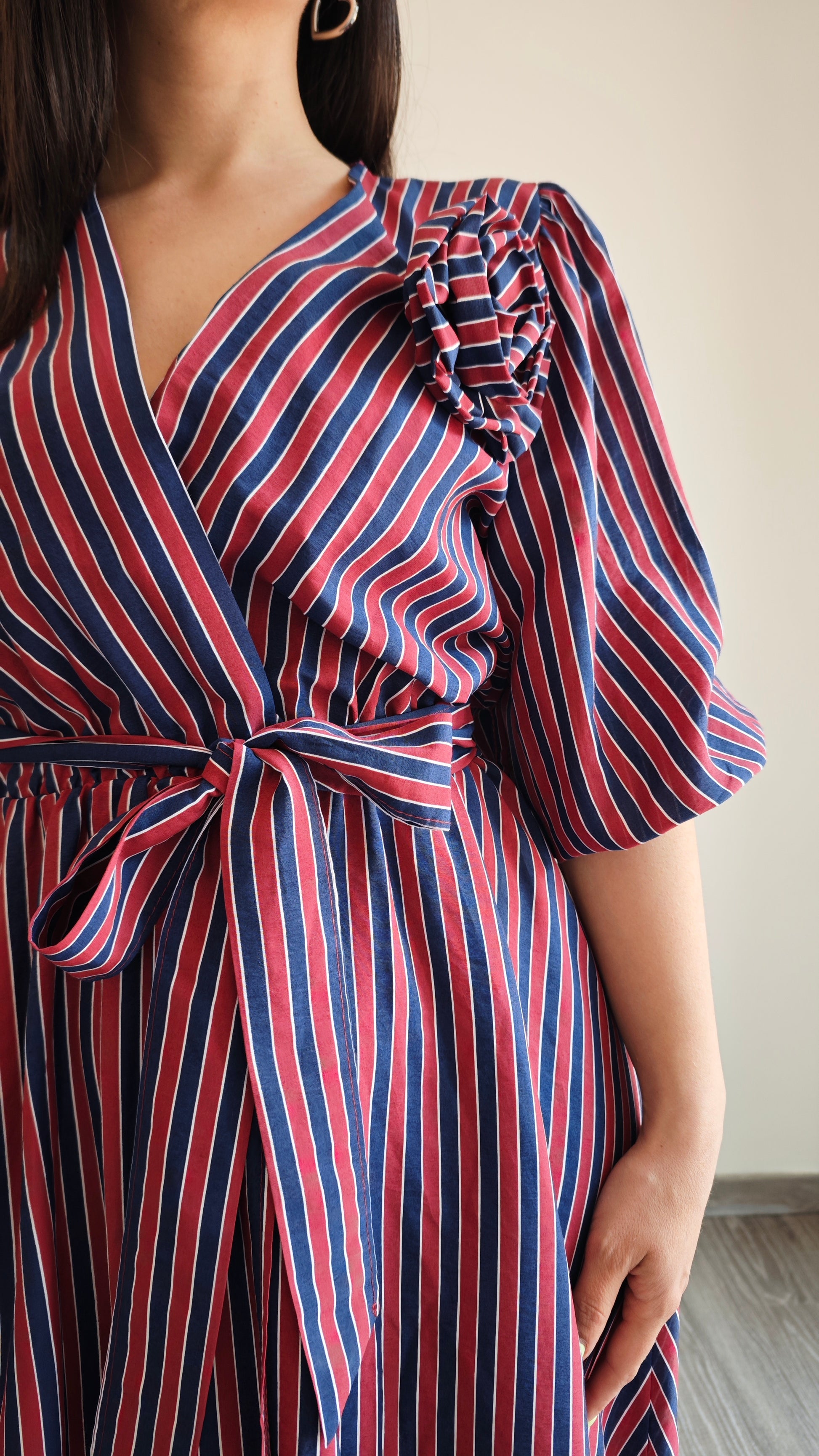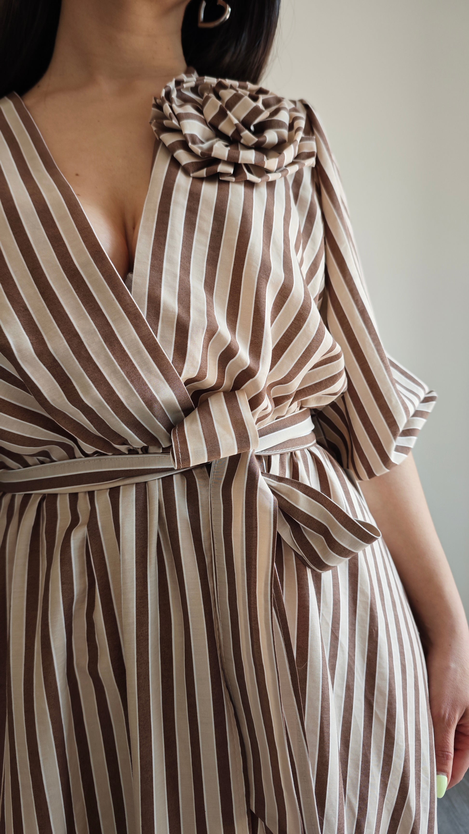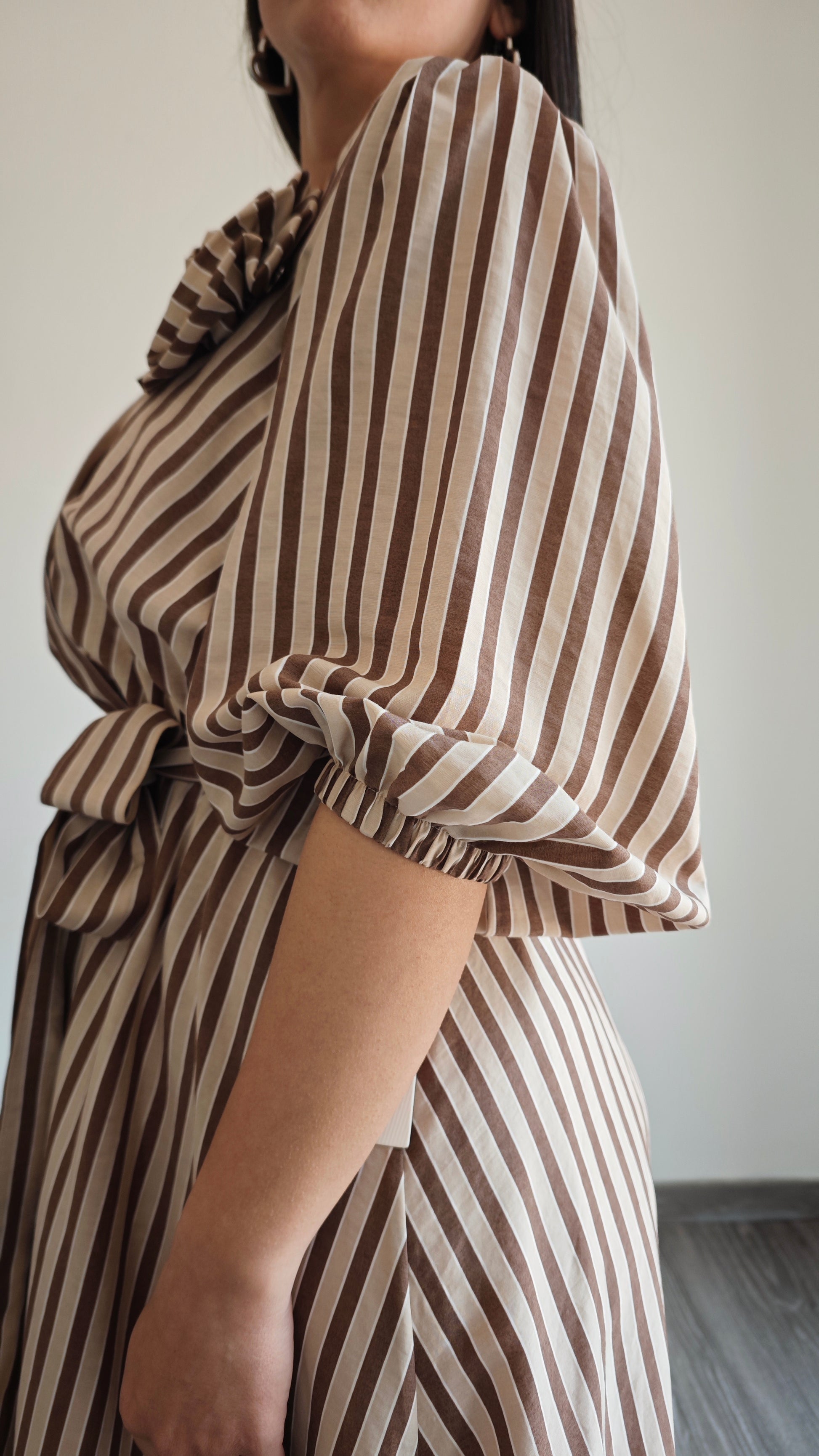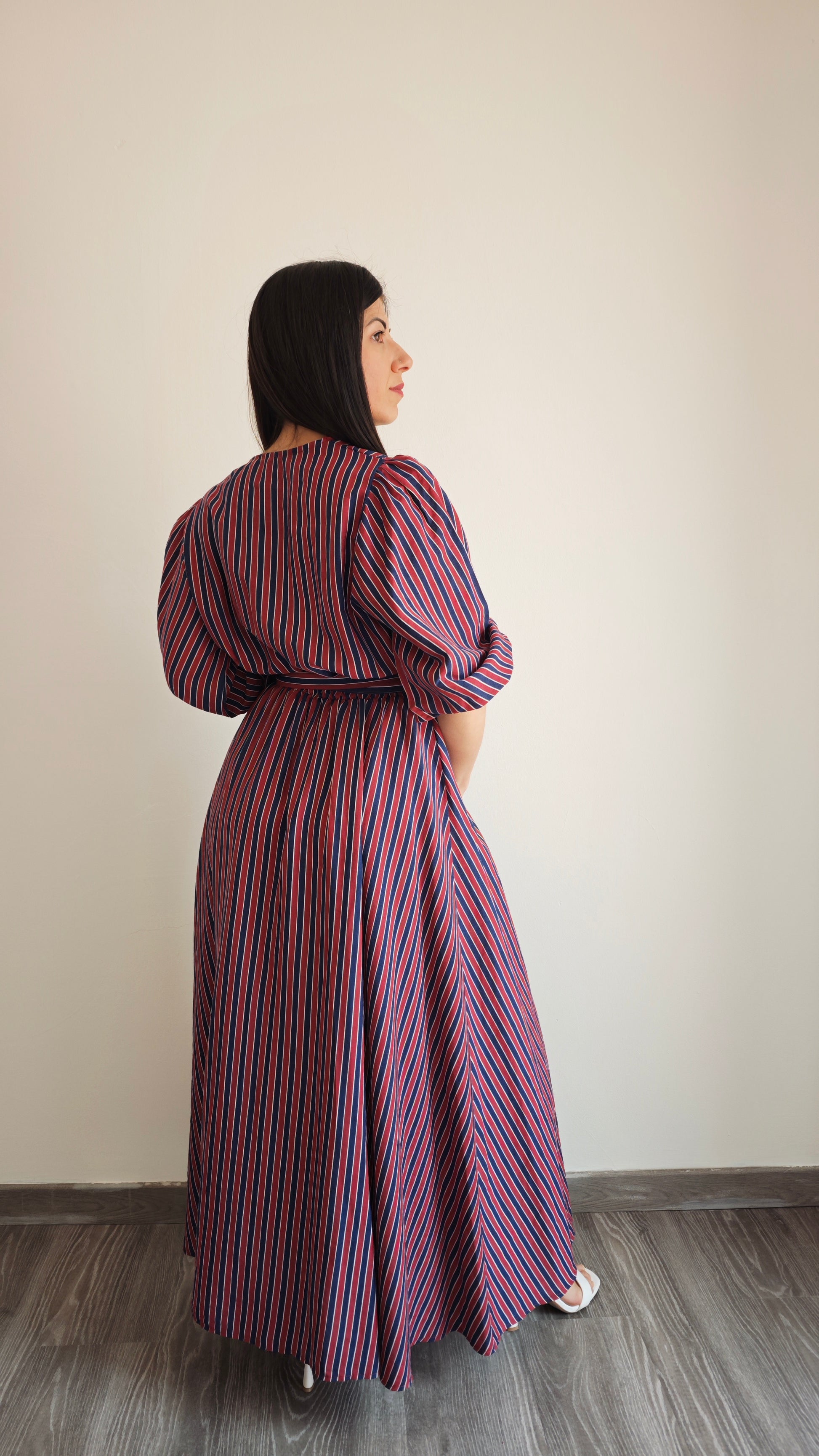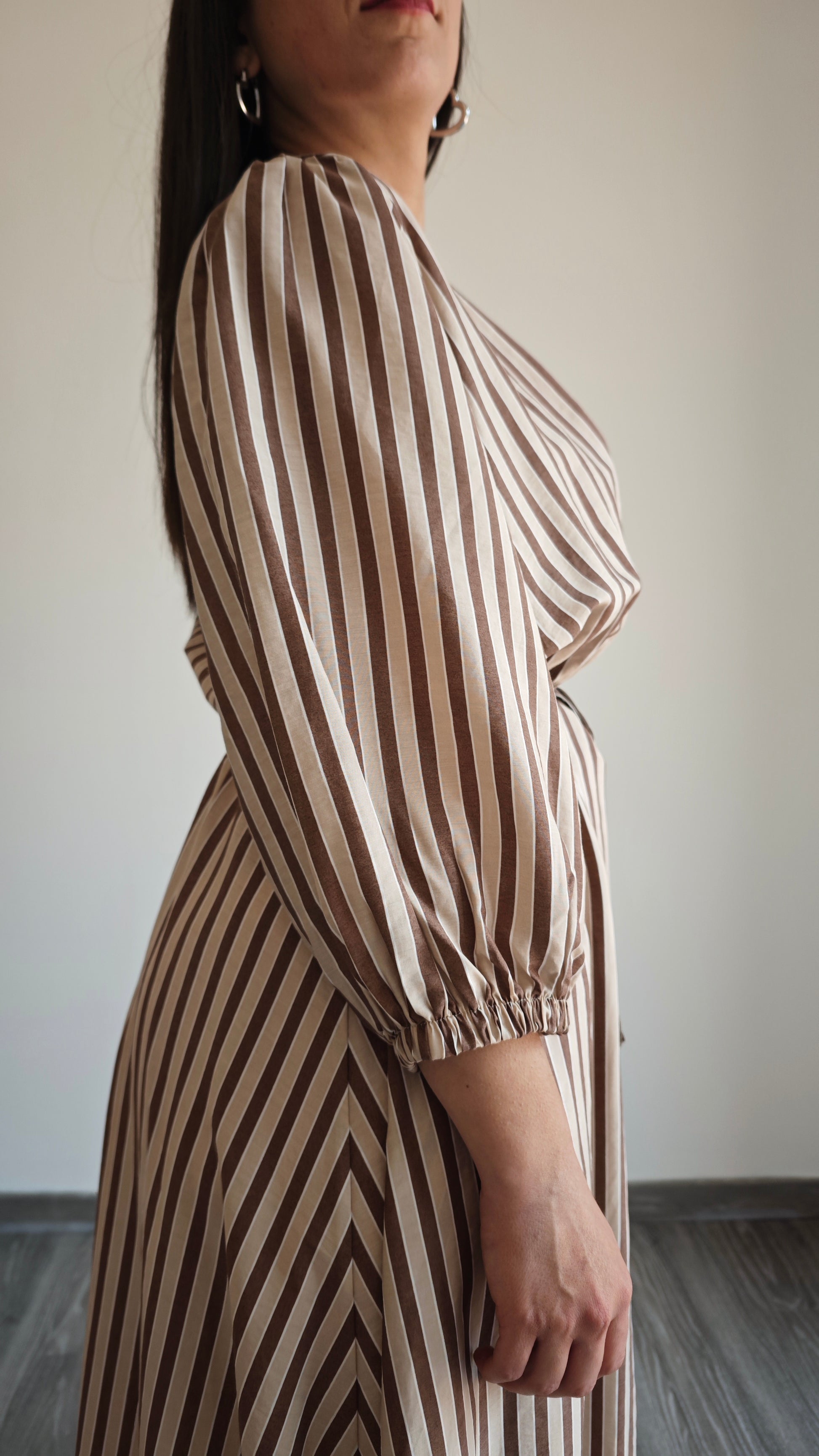 Abito Lungo a Righe con Spacco Laterale, realizzato in morbido cotone, spilla staccabile per un tocco di personalità. La vita elasticizzata e la fusciacca si adattano perfettamente alla tua silhouette, mentre lo spacco profondo aggiunge un tocco di femminilità. Perfetto per un look raffinato e confortevole.