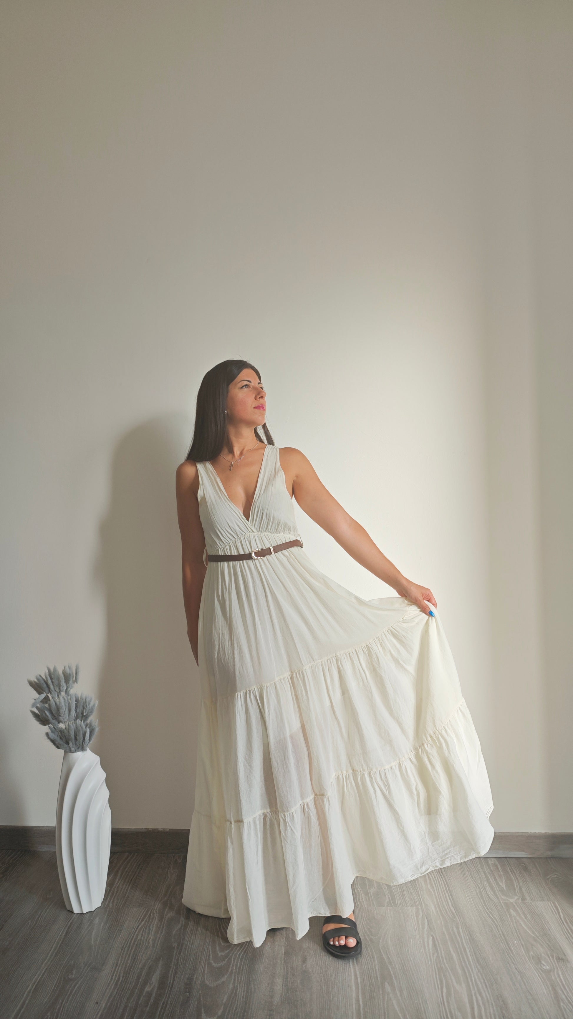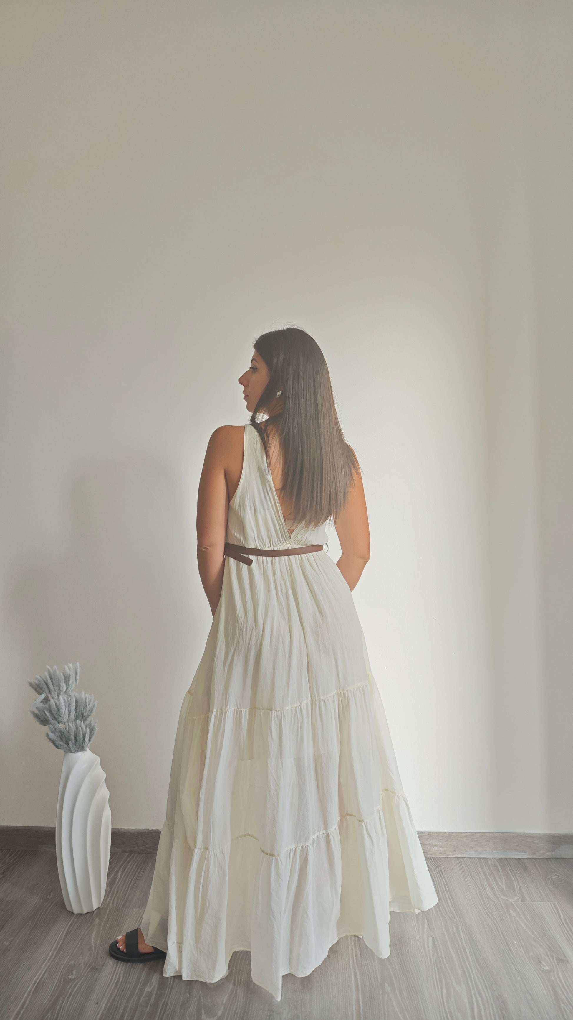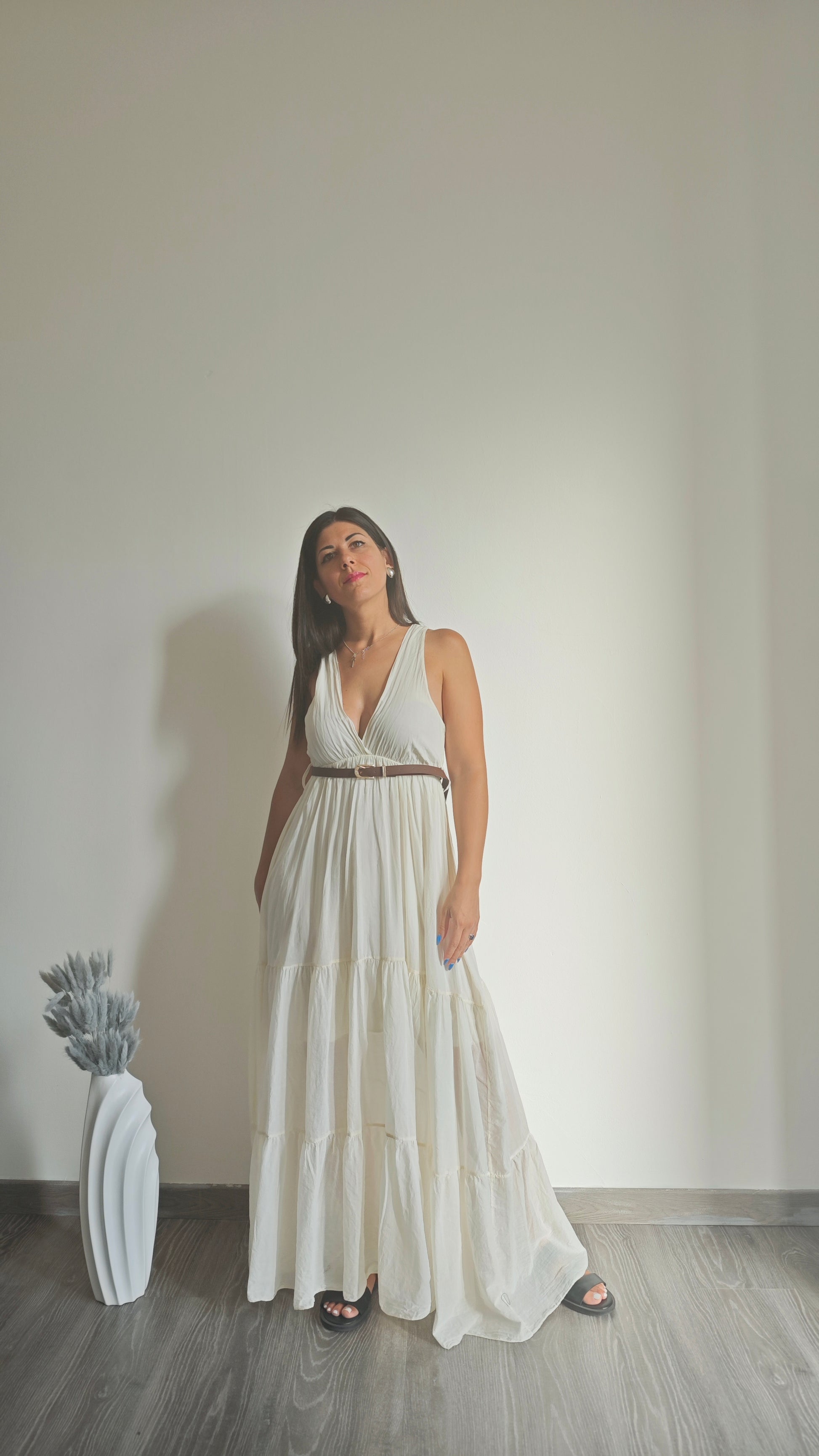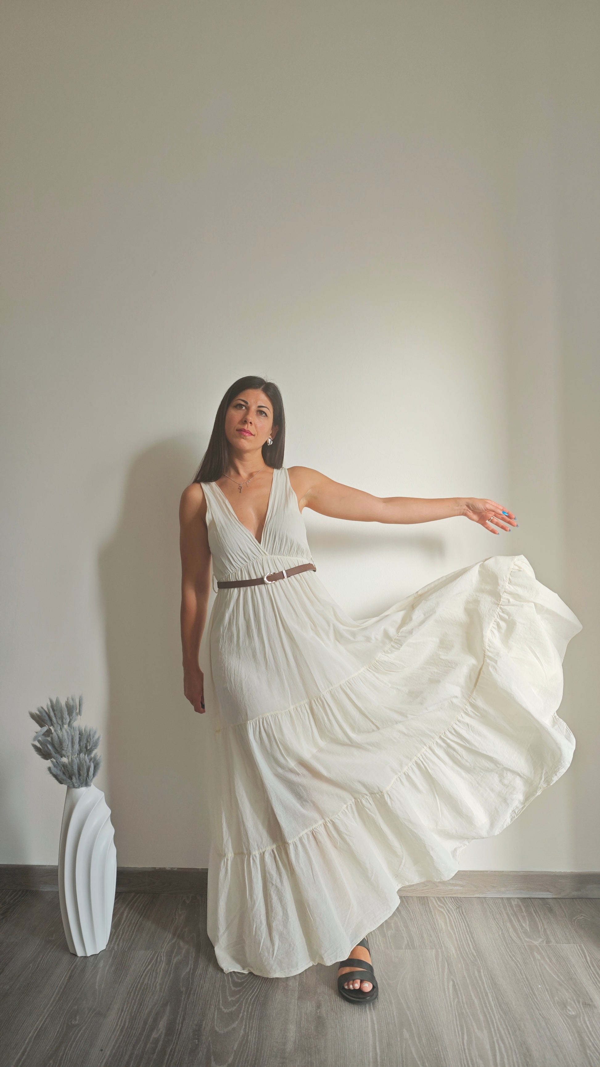 Questo elegante abito lungo in mussola con balze è la scelta perfetta per l'estate. In 100% cotone. La fodera garantisce una vestibilità confortevole mentre la cintura a contrasto aggiunge un tocco di stile. Indossalo per un look alla moda. Interamente realizzato in Italia