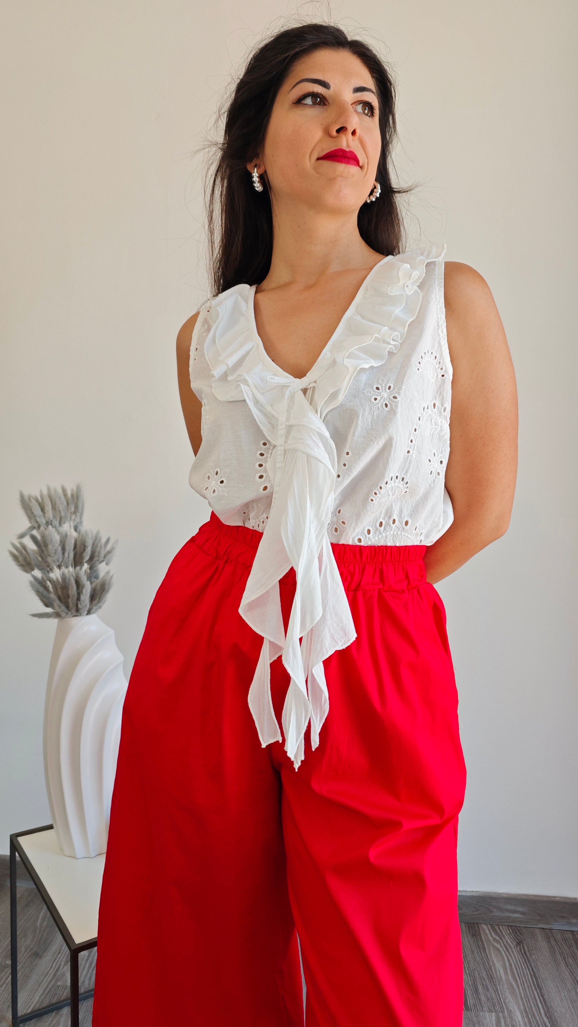 Blusa in pizzo sangallo made in Italy con scollo a v e elegante rouge che valorizza la figura. Perfetta per un look sofisticato e raffinato, lo stile italiano si unisce alla delicatezza del pizzo per un capo unico e di alta qualità.