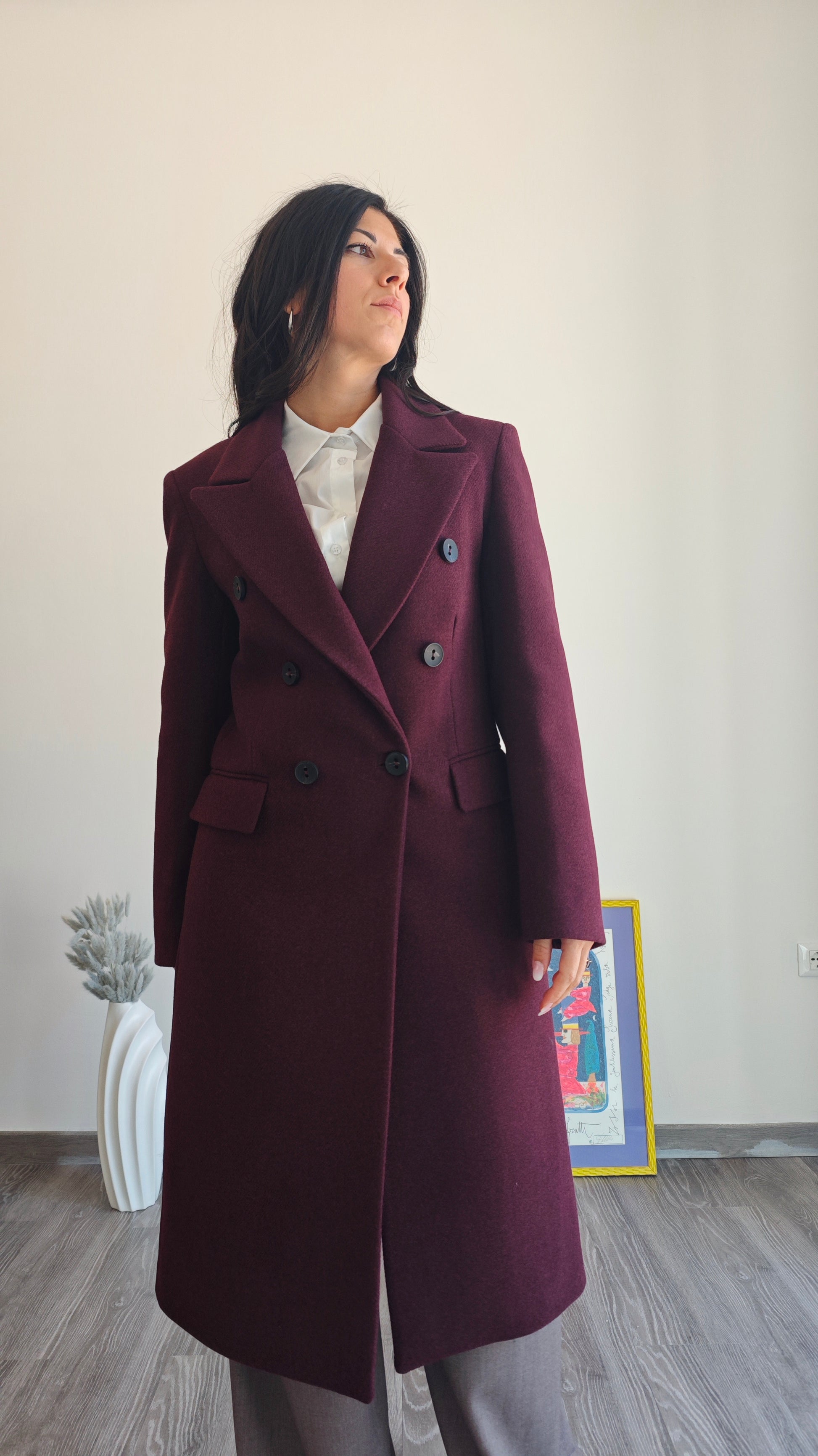 Questo elegante Cappotto Lungo doppio petto di colore Borgogna è la scelta perfetta per un look sofisticato e di classe. Realizzato in Italia con materiali di alta qualità, è foderato all'interno per garantire calore e comfort. Il bottone nero a contrasto aggiunge un tocco di stile senza compromettere la funzionalità.