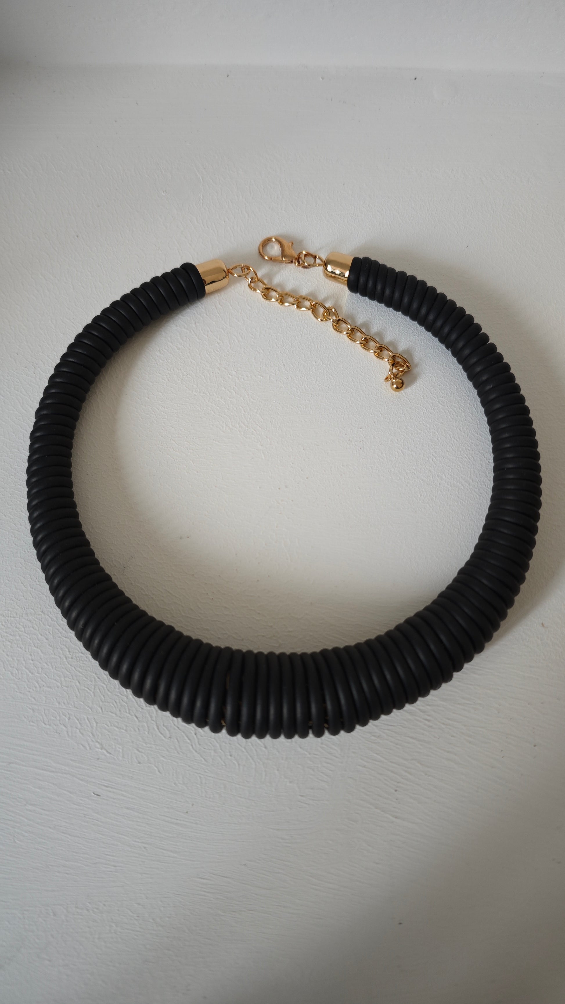 Una collana che non passa inosservata: rivestimento in gomma sulla collana rigida effetto spirale, leggera ma di forte presenza. Il design bold ma essenziale la rende perfetta per chi ama gli accessori dal carattere deciso, ma facili da abbinare.
