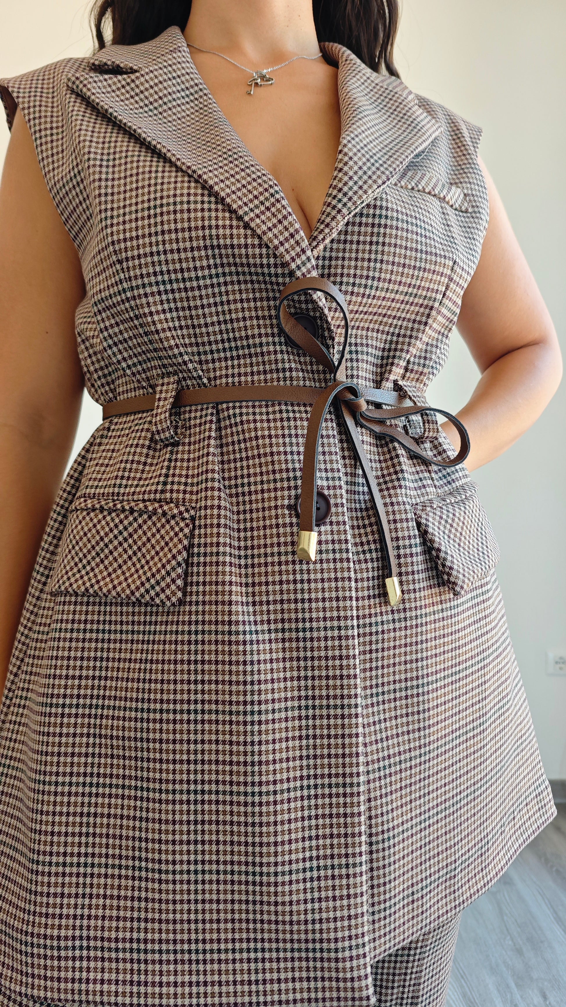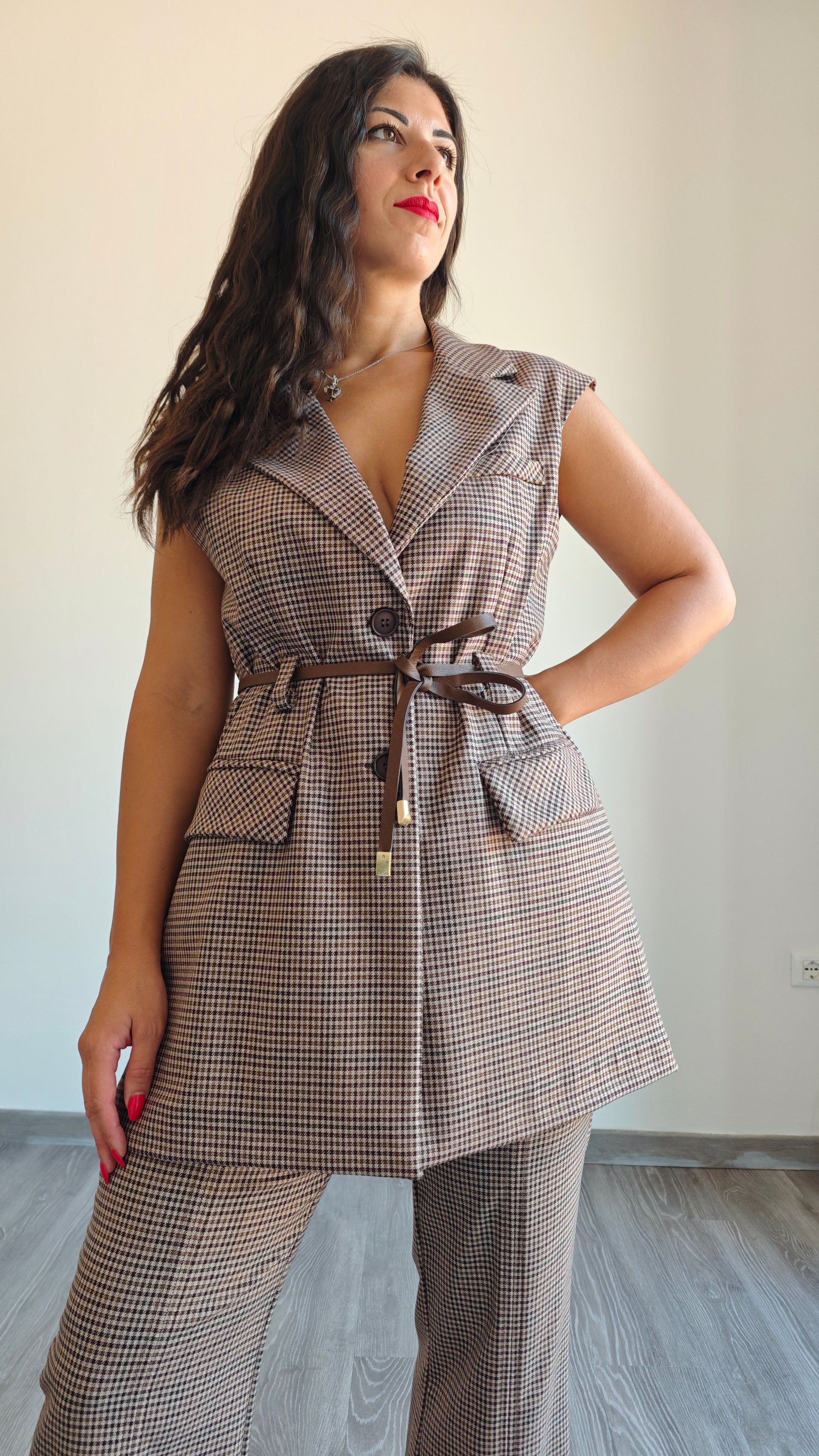 Realizzato in Italia, il nostro Gilet Lungo monopetto cerca di soddisfare ogni esigenza di stile e comfort. Il morbido tessuto beige con motivo pied de poul in Borgogna, verde e marrone conferisce un tocco di eleganza, mentre la cintura in vita e le tasche anteriori aggiungono funzionalità e praticità. Foderato per offrire il massimo del comfort, questo gilet è perfetto per completare il tuo look raffinato.