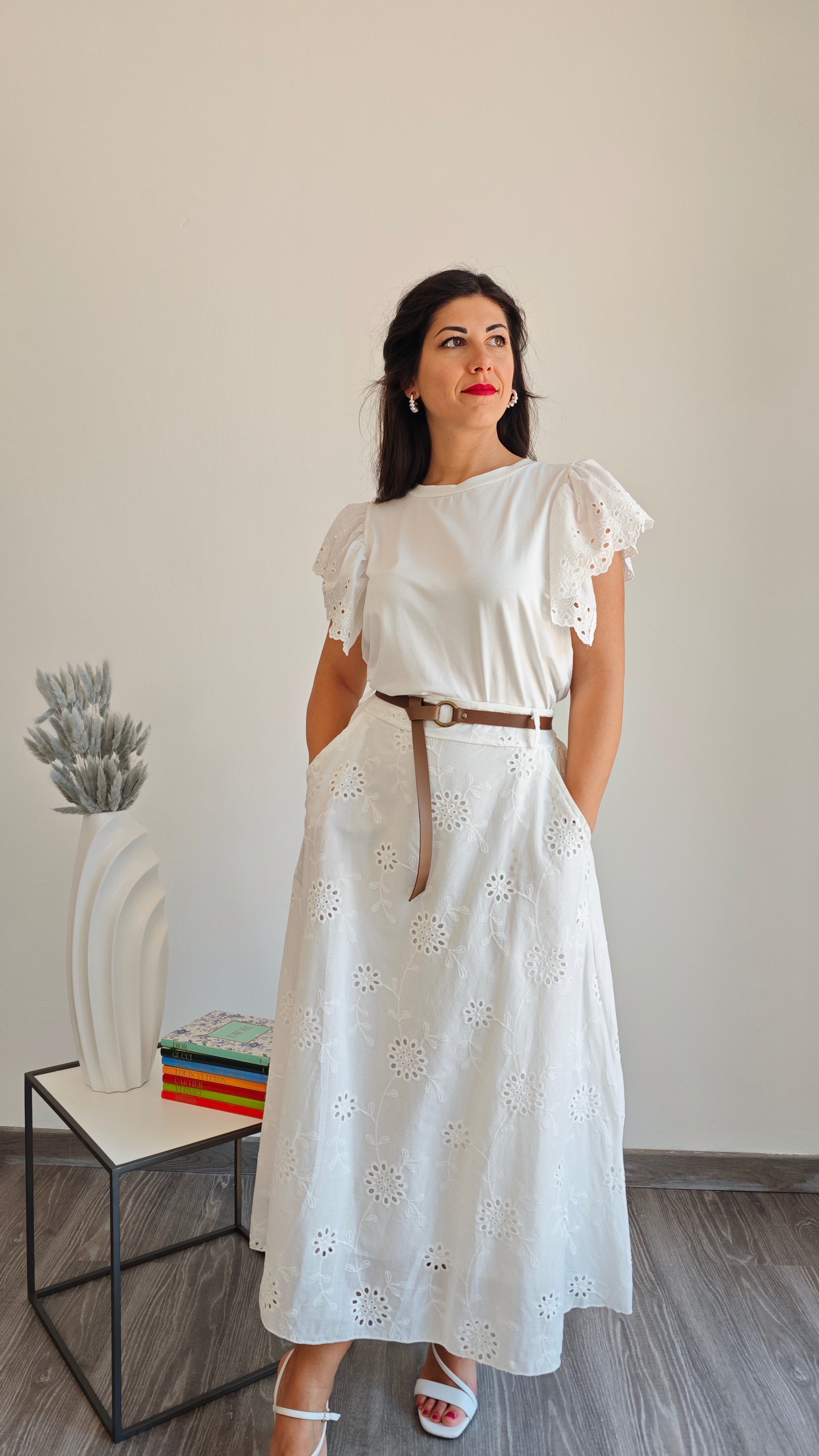Questa gonna midi in pizzo Sangallo è un capo elegante e versatile. Il suo design in pizzo sangallo con fodera e cintura la rende adatta a diverse occasioni. L'elastico in vita la rende comoda da indossare, mentre le tasche aggiungono un tocco pratico. Oltre a essere alla moda, questa gonna offre anche comfort e praticità.
