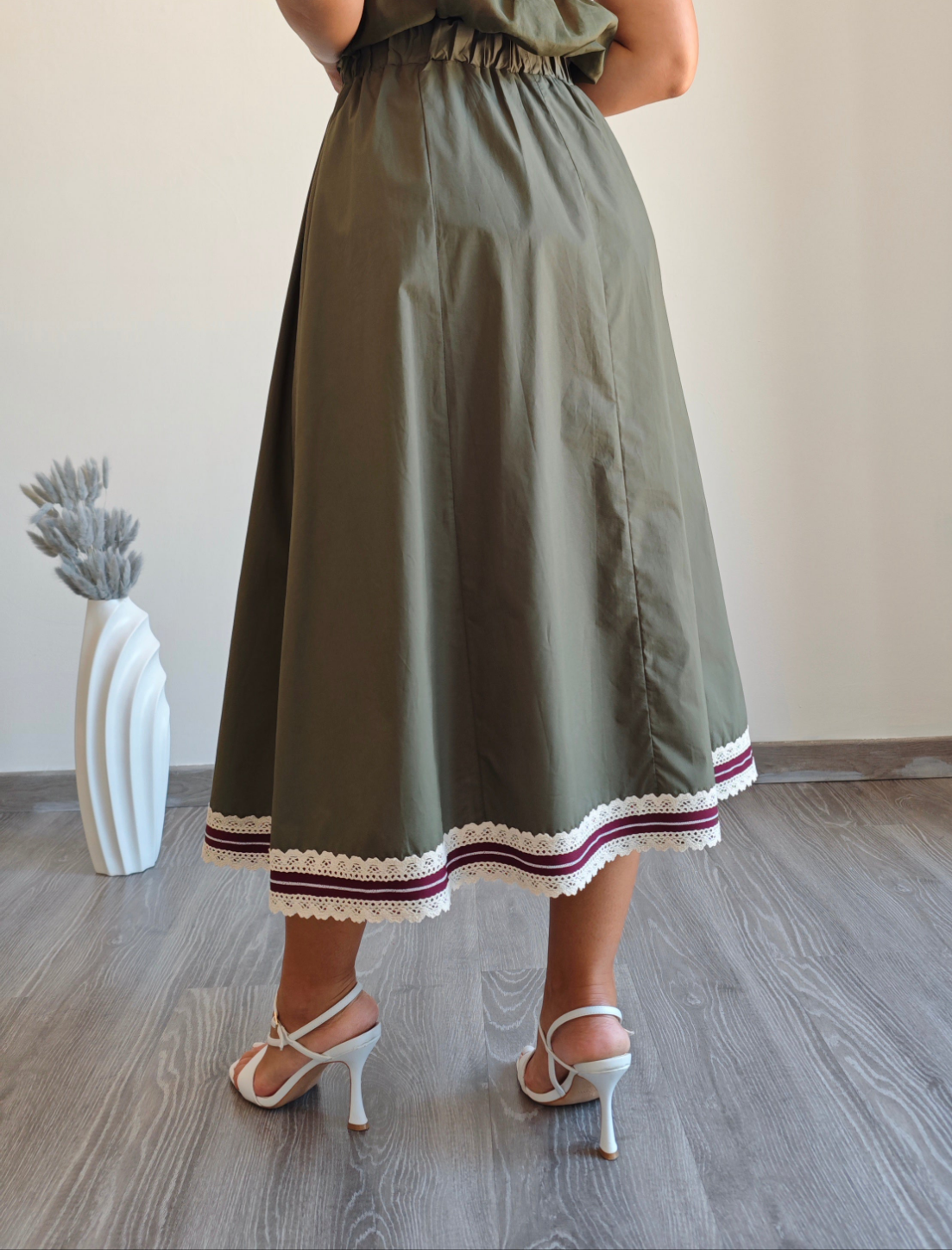 Questa meravigliosa gonna midi svasata è un must-have per la tua collezione di abbigliamento. Realizzato completamente in Italia al 100% in cotone, presenta un elegante ricamo sul fondo, un elastico in vita per una vestibilità perfetta e un finto laccio a contrasto per un tocco di stile. Aggiungi una nota di lusso e di classe al tuo look con questa gonna unica.