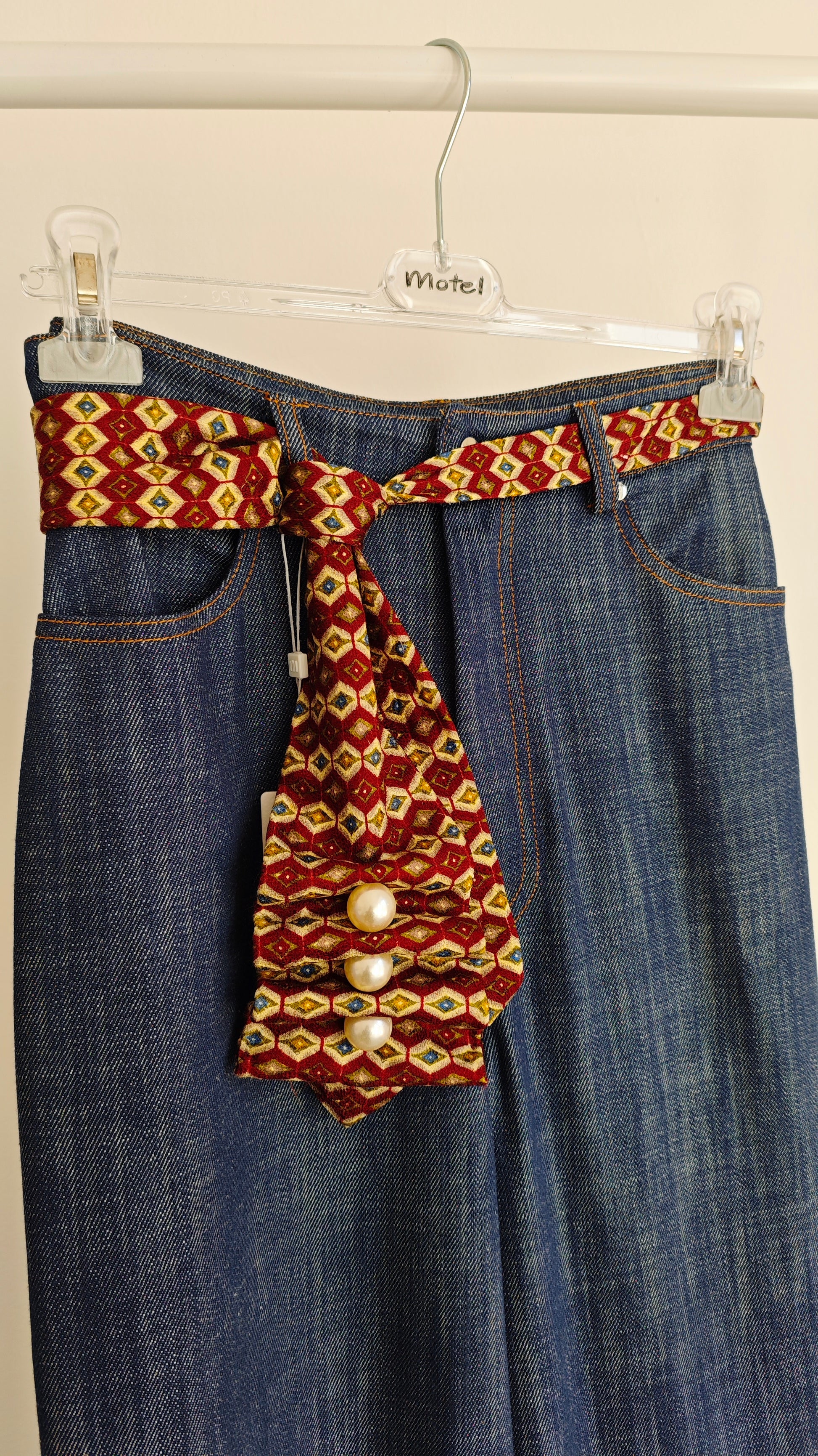 Pantalone palazzo tessuto jeans con cravatta rielaborata a mano dal brand con applicazione che rende il capo un pezzo unico.