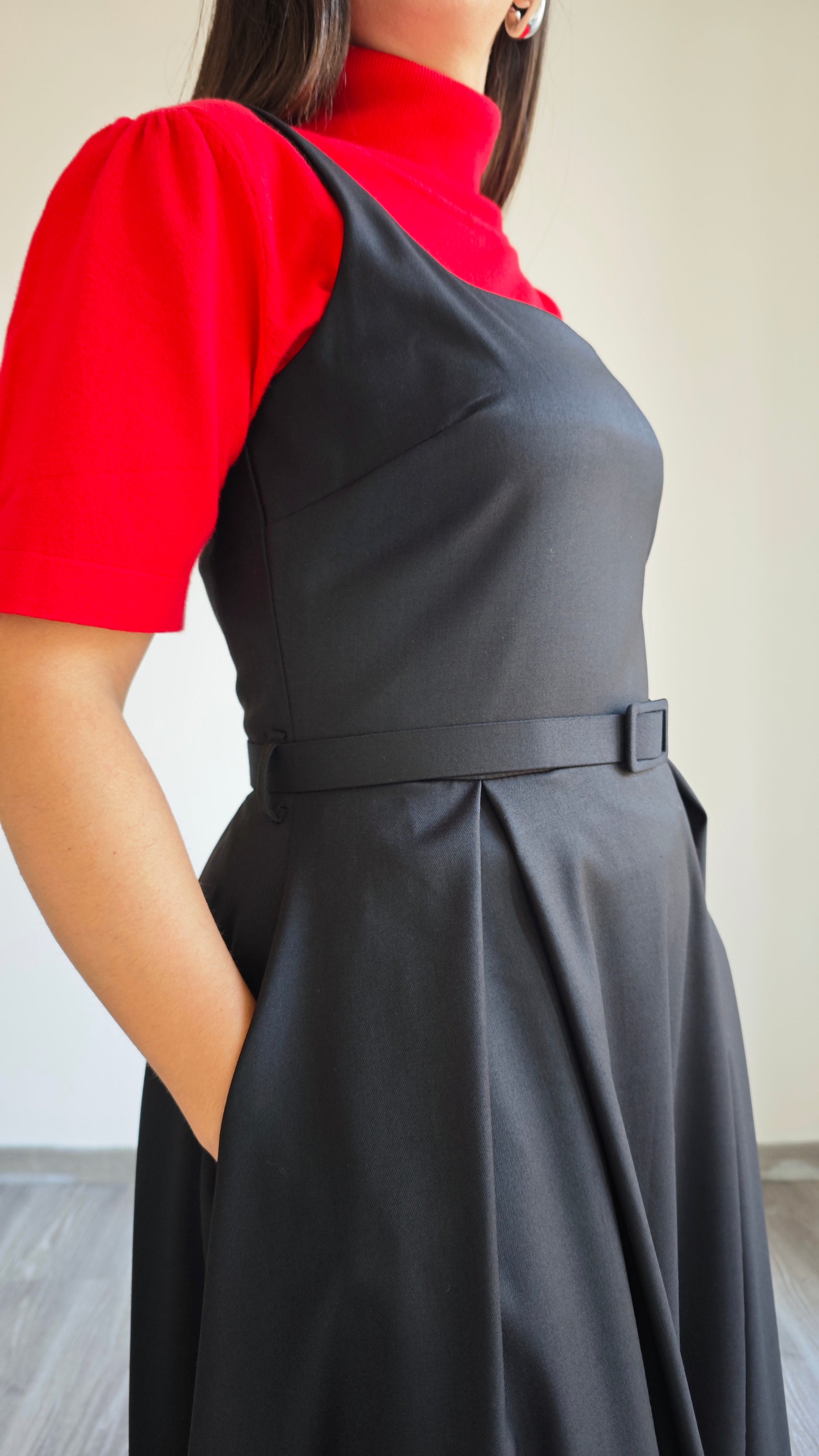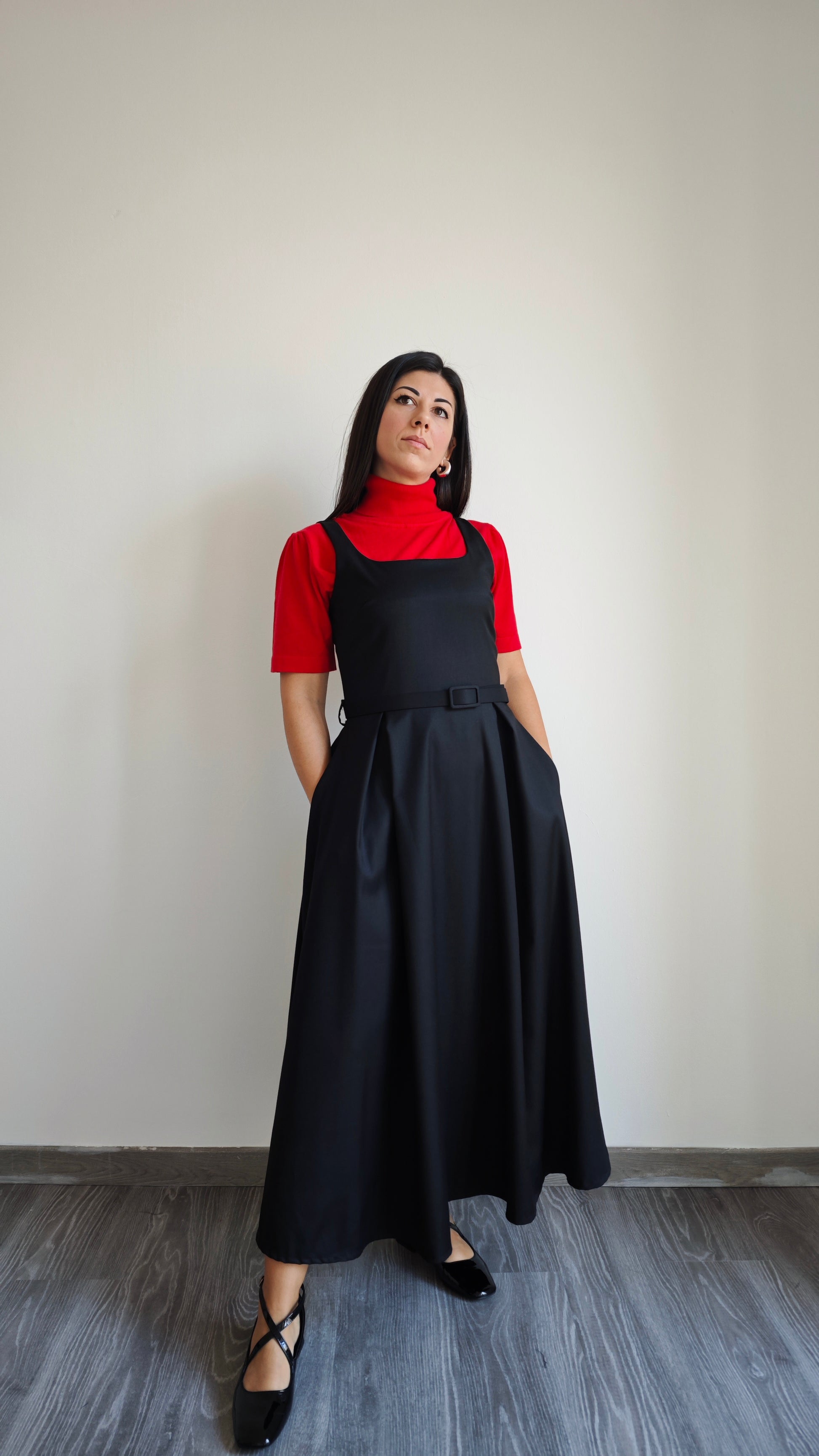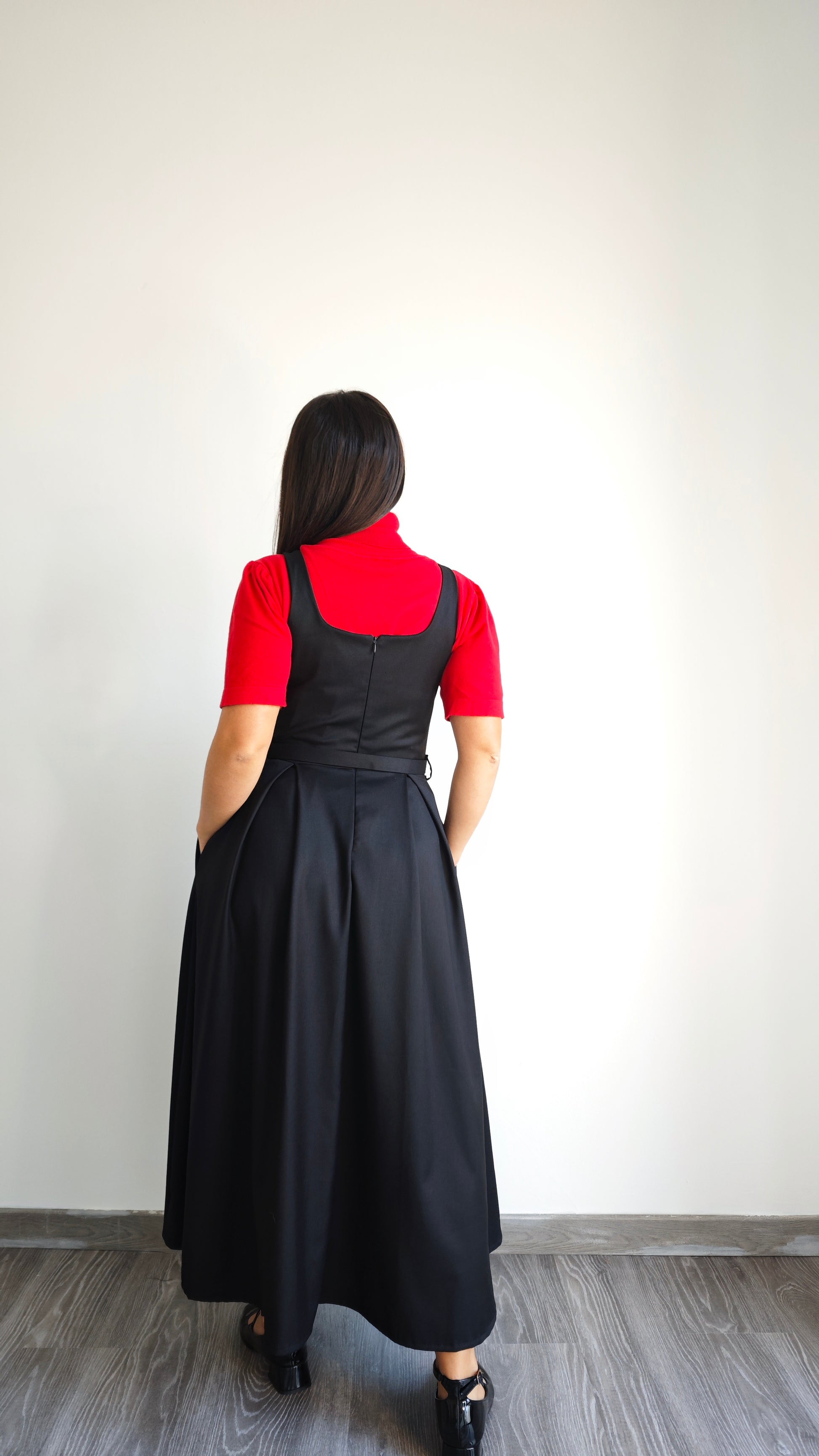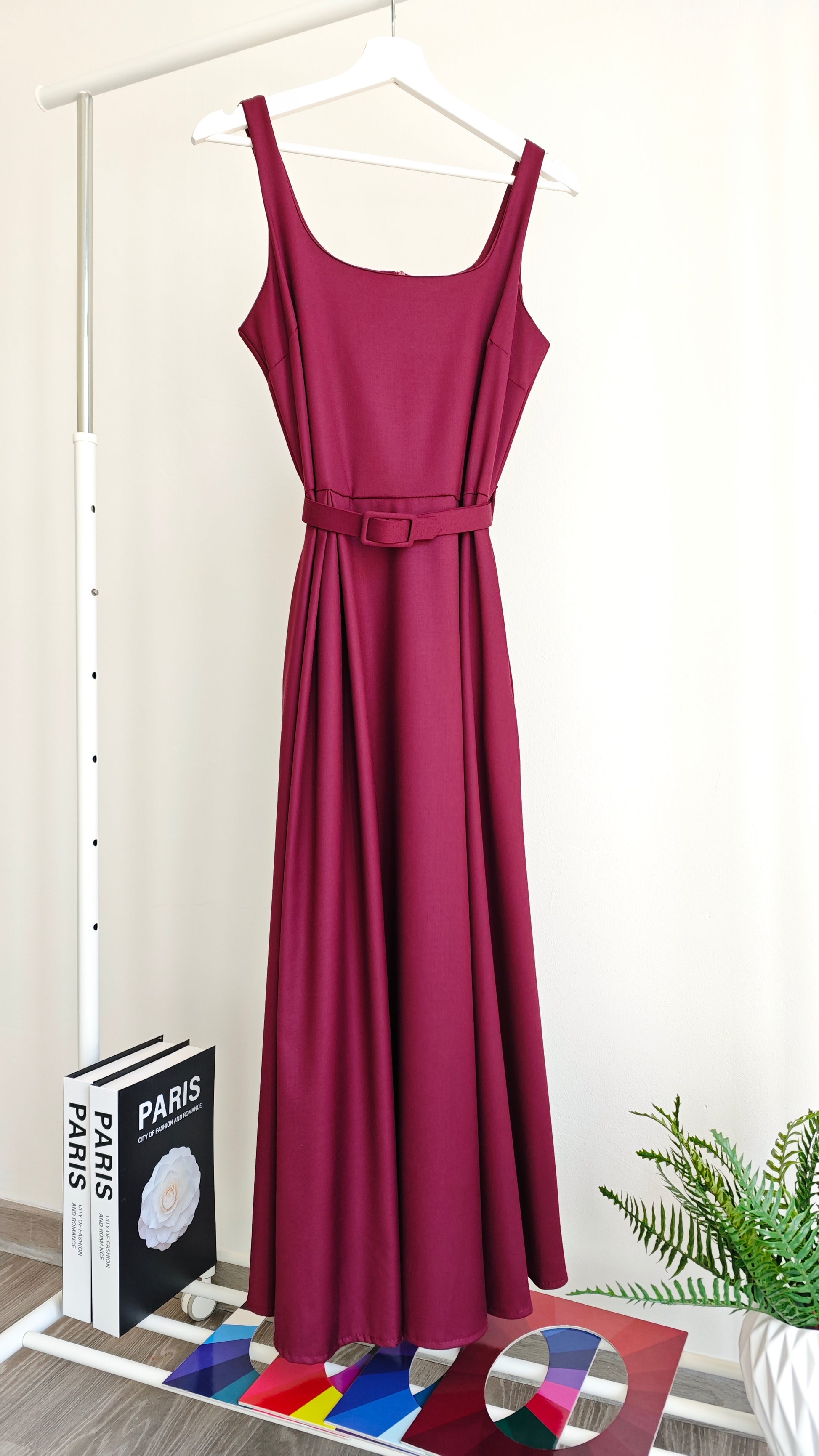 Abito lungo con gonna ruota, 2 tasche, cintura regolabile in vita con passanti, scollo rotondo, con bretelle larghe, cerniera sul retro del vestito, plissé sulla gonna aggiunge un tocco di femminilità e movimento al tuo look. La scelta perfetta per occasioni speciali. Aderente nella parte superiore del vestito.