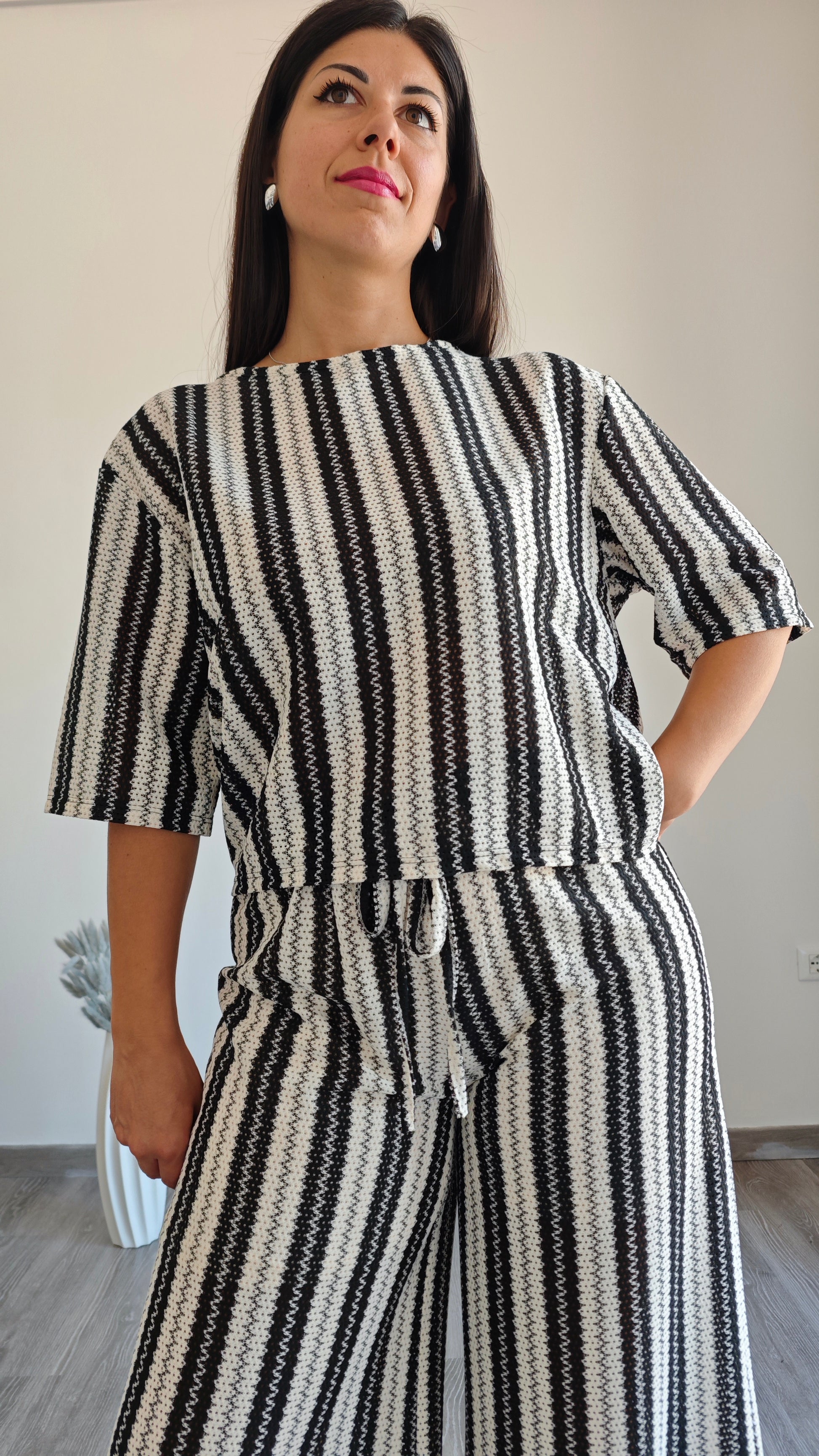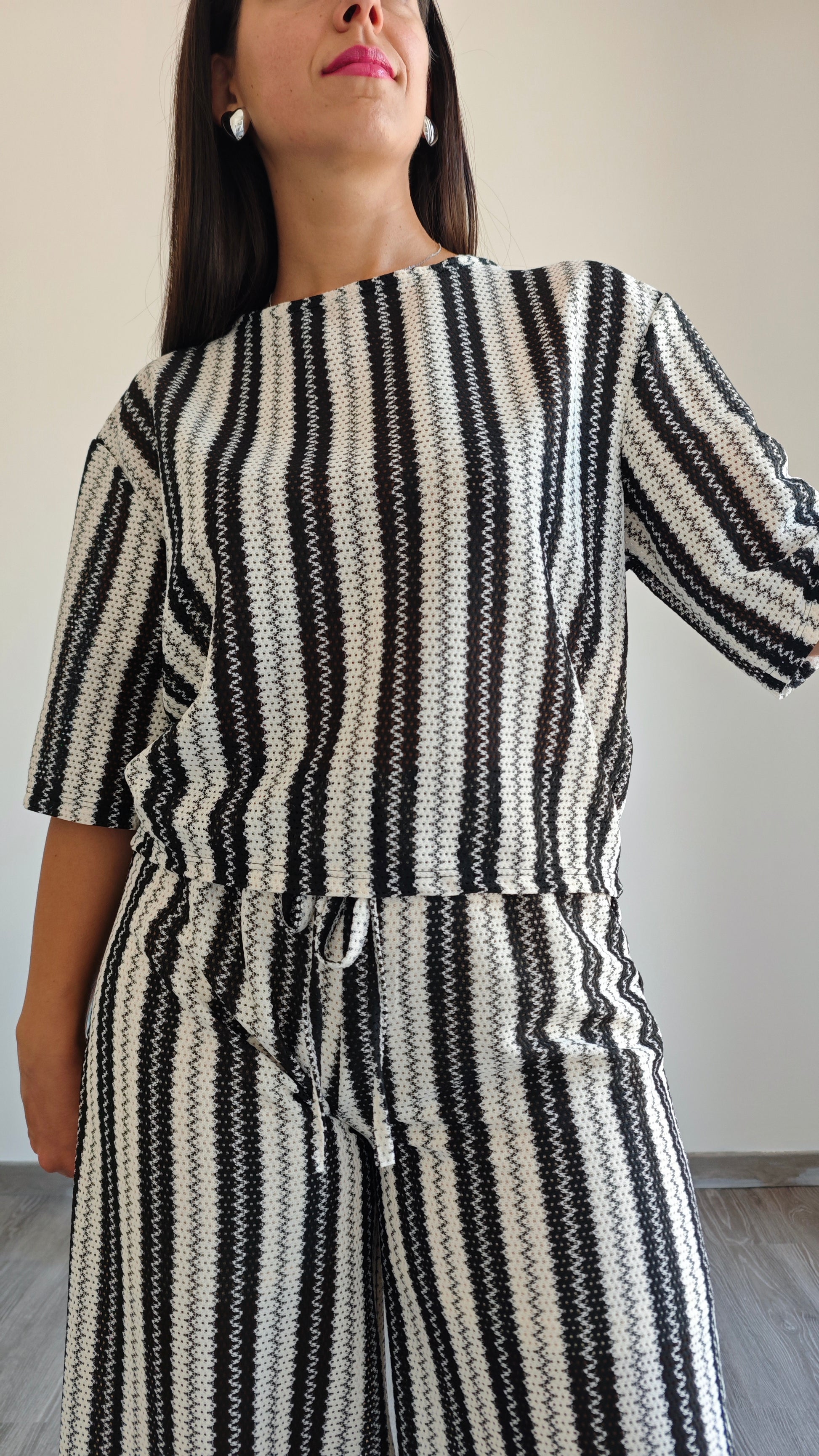 Questa T-shirt scatolina mezza manica è perfetta per un look elegante e casual. Realizzata con ricamo a righe verticali in bianco e nero, aggiunge un tocco di stile alla tua collezione. Il tessuto traforato garantisce un comfort leggero e traspirante, perfetto per un'occasione informale o un giorno in ufficio.